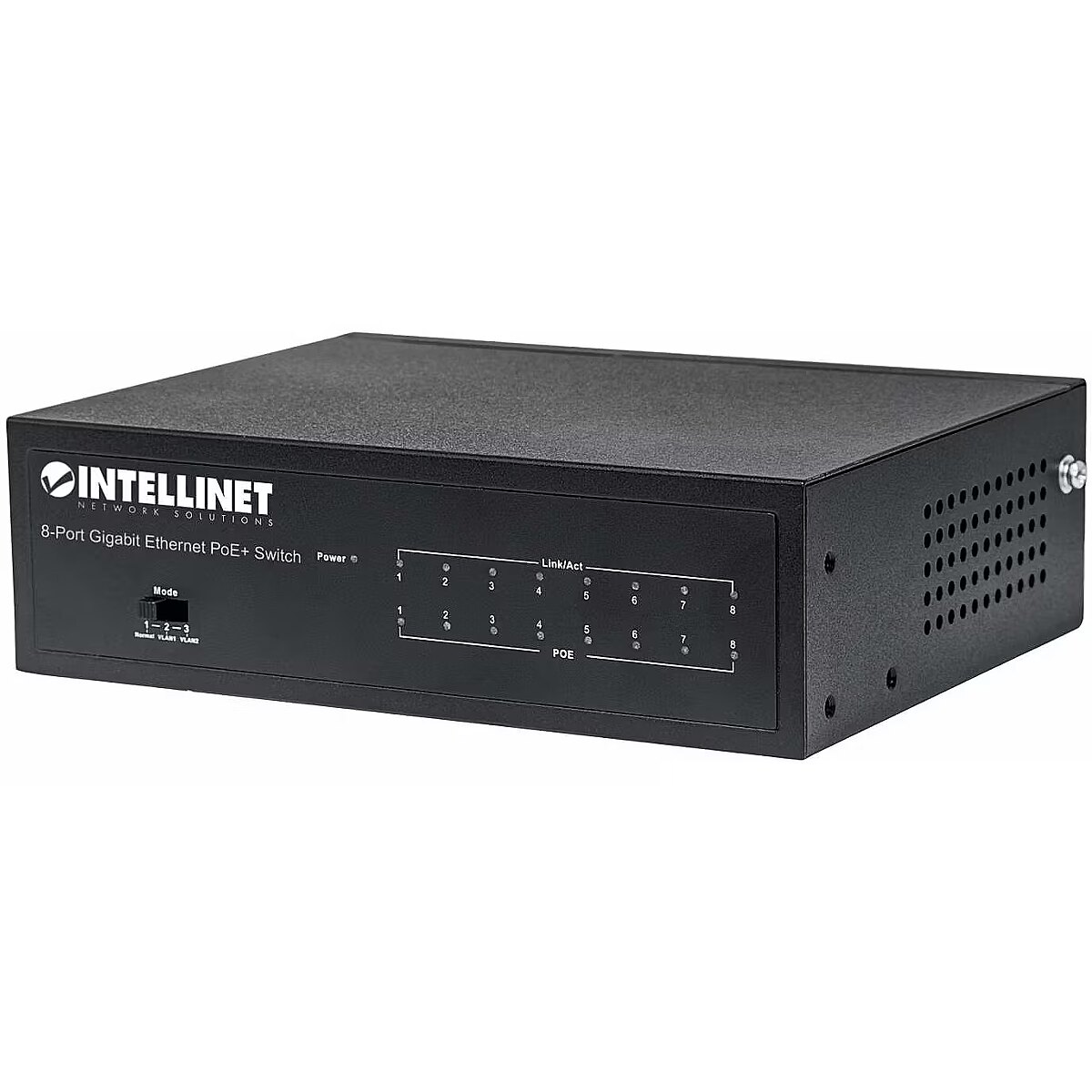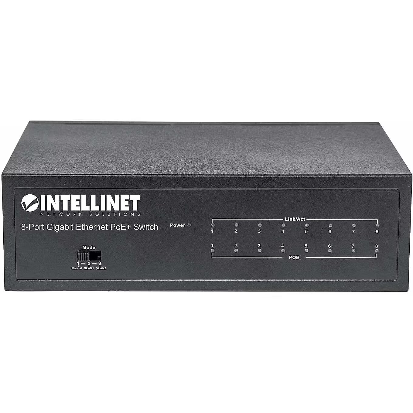LongDesc - Save installation time and money with PoE. The Intellinet Network Solutions 8-Port Gigabit PoE+ Switch is designed to pass both data and electrical power to a number of PoE-compatible devices via standard Cat5e or Cat6 network cables. Equipped with eight Gigabit Ethernet ports, this switch can power wireless LAN access points and bridges, VoIP phones, IP video cameras and more while delivering network speeds of up to 1000 Mbps. Power over Ethernet 802.3at The Intellinet Network Solutions 8-Port Gigabit PoE+ Switch supports the IEEE 802.3at protocol and is designed to inject up to 30 watts of power per port*. IEEE802.3af- or IEEE802.3at-compliant devices attached to the switch require no additional power, thus eliminating the time and expense of electrical rewiring and minimising the unsightly clutter caused by power supplies and adapters in awkward places such as ceilings and walls. Any mix of PoE and non-PoE devices is supported, and thanks to its short circuit, overload and high-voltage protection function, your equipment is well-protected. Private VLAN The Intellinet Network Solutions 8-Port Gigabit PoE+ Switch features port isolation, also referred to as "Private VLAN". It isolates all ports from each other and only allows access to the uplink port. This is useful, for example, if a private VLAN is a hotel where each room or apartment has a network port for Internet access. All ports can all access the Internet, but they cannot access each other. The setup is easy: Activate the VLAN switch on the front panel of the switch, and the VLAN is enabled. That is secure port isolation with the flip of a switch! Green Ethernet Technology More often than not, a network switch does not utilize all its ports at all times. Normally, when a computer, notebook, network printer or other network device is powered down, the switch continues to consume the same amount of power as if it were active. Now, thanks to the new energy-efficient IEEE 802.3az technology, the Intellinet Network Solutions 8-Port Gigabit PoE+ Switch detects link status to all connected devices and reduces the power usage of ports not in use. In addition, the Intellinet Network Solutions switch can adjust the level of power output based on the length of the network cable connected to a particular port. With the Intellinet Network Solutions 8-Port Gigabit PoE+ Switch you will enjoy maximum network performance, but when things slow down it automatically scales back power usage to conserve energy and save money. * Total PoE budget for this switch is 60 watts. Per-port average power distribution is 7.5 watts; maximum per-port power usage cannot exceed 30 watts.