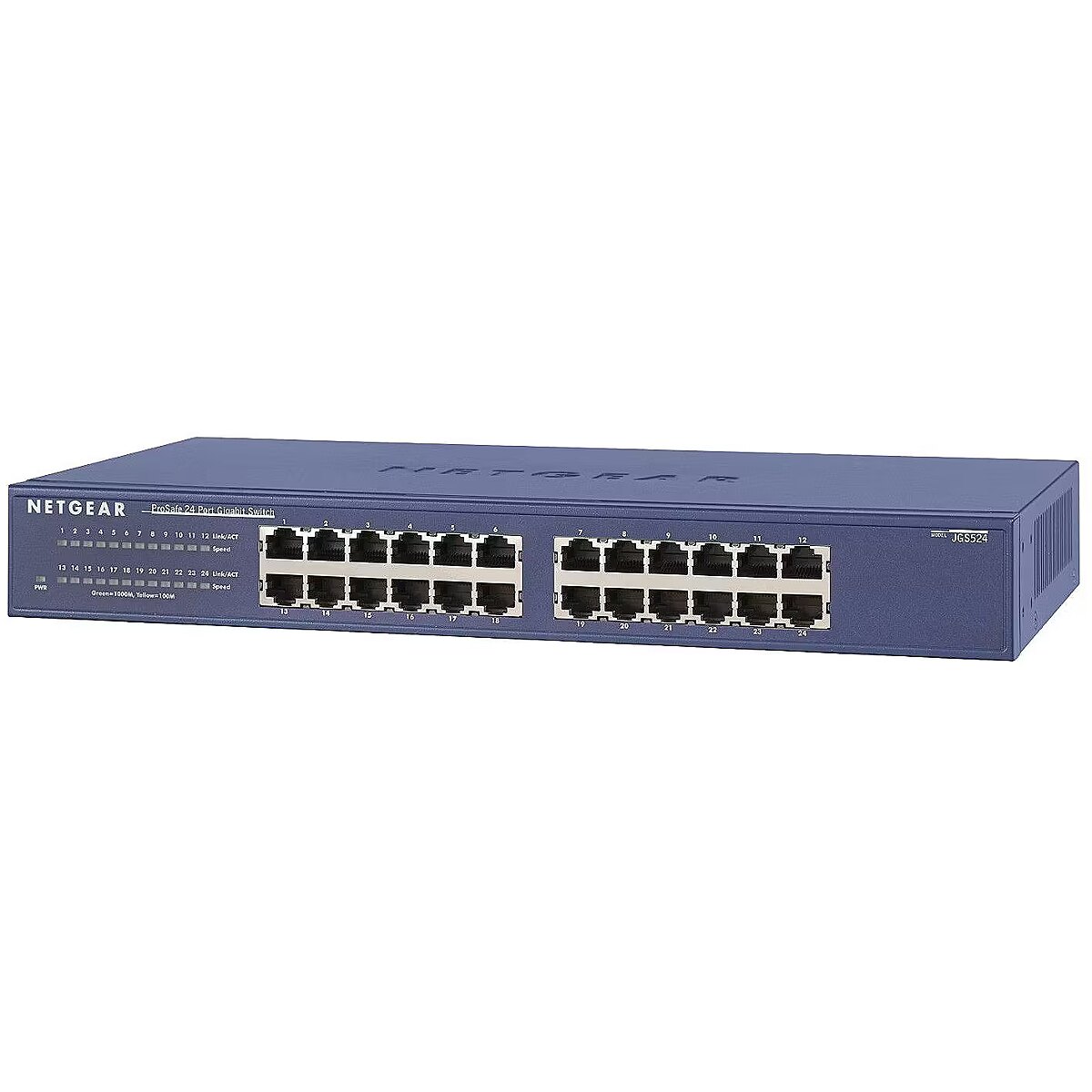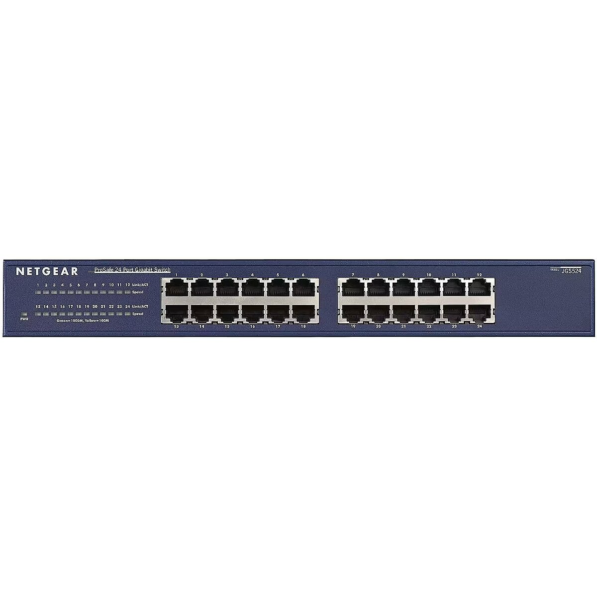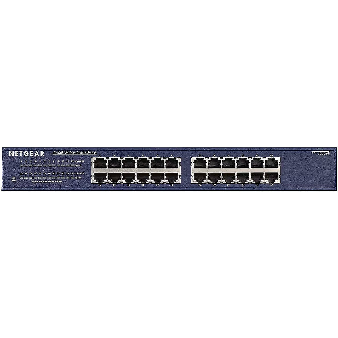 LongDesc - The affordable price of NETGEAR’s JGS524 enables you to cost-effectively deliver Gigabit Ethernet networking speeds across your entire office network – even directly to the desktop. With up to 48 Gbps of bandwidth, this 24-port switch can send 2000 Mbps per port. Network users can take advantage of the their ability to send and receive large amounts of multimedia, image and video information in no time at all. The JGS524 is ideal for teams, departments or growing offices requiring outstanding performance at a low price.-Gigabit speeds meet performance needs of bandwidth hungry applications.-Easy integration of 10, 100, and 1000 Mbps devices.-Automatic speed and full/half-duplex sensing on every port.-Auto Uplink™ on every port to ensure correct link for different cables.-LED’s make network monitoring easy.-Compact enough for desktop, but comes with a rack mount kit.-Compatible with PC, Macintosh, Linux and Unix operating systems.
