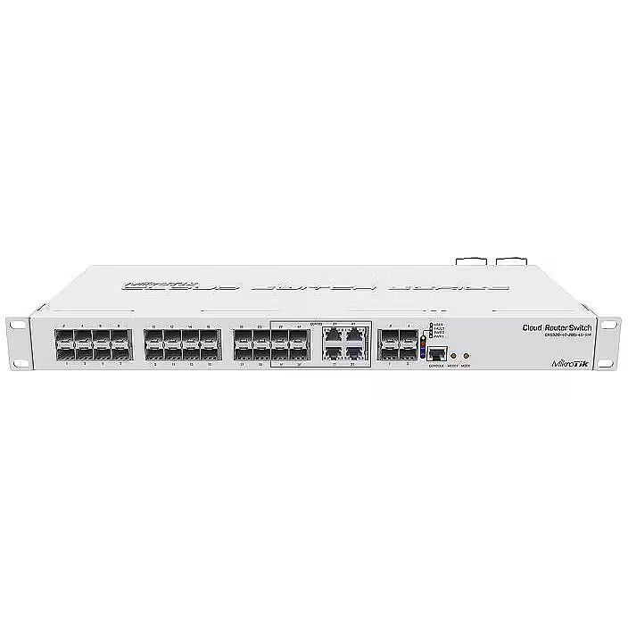 Description - MIKROTIK CRS328-4C-20S-4S+RM The CRS328-4C-20S-4S+RM is a 28 independent port switch with a combo group. This device has twenty SFP ports, four SFP+ ports for 10G modules and four combo ports, where you can choose to use SFP or RJ45 ports from the combo group. These ports can also be software selected, so if you have plugged in all eight cables, you can use scripting, to decide which four combo ports will be active. The device comes in a 1U rackmount case with two 100-240 V power supplies with failover functionality. A RJ45 console port is available for management and debugging, and a mode button can be customised to execute any RouterOS commands. The device has a “Dual boot” feature that allows you to choose between two operating systems - RouterOS or SwOS.