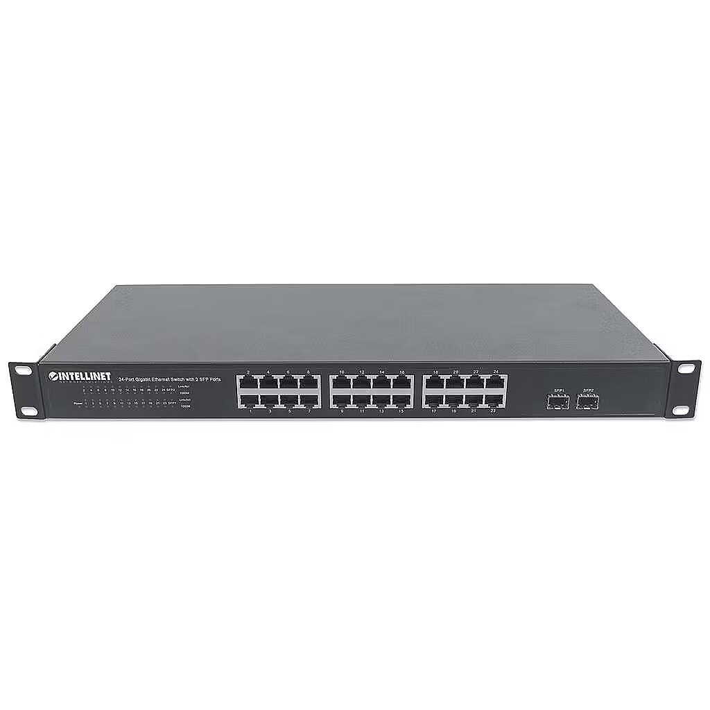 Title - Intellinet 24-Port Gigabit Ethernet Switch with 2 SFP Ports, 24 x 10/100/1000 Mbps RJ45 Ports + 2 x SFP, IEEE 802.3az (Energy Efficient Ethernet), 19" Rackmount, Metal