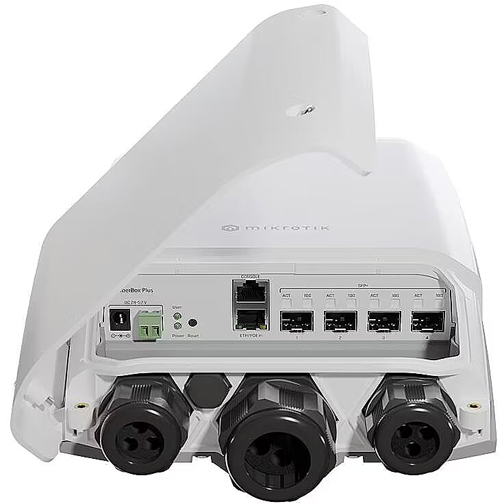 Description - FiberBox Plus Ultimate value pick for 10 Gigabit outdoor networking. High masts, poles, or towers – your connection will be safe! A powerful budget version of the netFiber 9. There are two ways to look at the brand new Fiber Box Plus. On the one hand, it’s a massive upgrade of our previous FiberBox devices. This version features a modern ARM CPU, more RAM, and four 10-Gigabit SFP+ ports. Fast and reliable connectivity on a budget. Without the distance limitations of Ethernet. There’s also a Gigabit Ethernet port for management purposes or PoE-in powering. We’ve also included a 2-pin terminal and a standard DC jack, so you have 3 different power options to choose from. FiberBox Plus supports a wide input voltage range of 24-57V. And it is remarkably efficient: maximum power consumption (without attachments) is only 7W. Another way to look at the new FiberBox Plus – it’s a budget version of the amazing netFiber 9. You can save a lot of money if you don’t need the extra Gigabit SFP ports. It even features the same impressive Marvell 98DX226S switch-chip, so the performance is definitely there! This rugged outdoor switch is perfect for connecting mast devices. Like the mANTBox 52 or the LHG XL 52. Imagine a huge campsite with several guest houses, a food court, and the owner’s cabin. You can connect all the locations with the FiberBox Plus. One of the fiber connections can be used for the mANTBox base station – to provide general connectivity for the guests. Another connection could go to the owner’s house. And the third could be used in the food court – to connect their payment and inventory servers. Usually, you would need some kind of a junction box to keep everything safe. But our FiberBox Plus comes with a solid water resistance rating of IP66. That means protection against powerful water jets from any direction. So in the campsite scenario, your setup is not only safe from all kinds of crazy weather, but it can also withstand young pranksters with a garden hose. Not to mention damp basements, elevator shafts, seaport infrastructure, and so on. With FiberBox Plus, you have nothing to worry about.