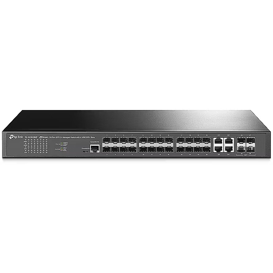 Description - TL-SG3428XF L2+ JetStream Managed Switch with 24 SFP Ports and 4 SFP+ 10GE Slots   Lightning-fast 10G connectivity: 4× 10 Gigabit SFP+ slots provide high bandwidth and switching capabilities. Fiber speeds: 20 Gigabit SFP ports and 4 Gigabit SFP/RJ45 combo ports provide fast and reliable connections to other switches and devices. Operation integrated with the Omada SDN platform: Unattended ZTP configuration, central cloud management and intelligent monitoring. Centralized management: Access from the cloud and Omada app is the convenience of management. Static routing: Controlling internal traffic enables more efficient use of network resources. Strong security strategies: IP-MAC-Port Binding, ACL, Port Security, DoS Defend, Storm control, DHCP Snooping, 802.1X, Radius Authentication and many more. Optimization of Voice and Video applications: L2/L3/L4 QoS and IGMP Snooping. Management: Web, CLI (Console Port, Telnet, SSH), SNMP, RMON and Dual Image provide great management capabilities.   Fast 10G uplink ports 4 SFP+ slots with a speed of 10 Gb/s ensure high bandwidth Gigabit fiber connections 20 gigabit SFP ports and 4 combo SFP/RJ45 ports provide stable connections Centralized management in the cloud SDN solutions are fully integrated with each other to create a high-performance network Advanced layer 2+ features Static routing, IGMP Snooping, 802.1Q VLAN and much more 10G full fiber switch Build and expand your high-speed network with TP-Link TL-SG3428XF, a fully managed switch with 20 Gigabit SFP ports, 4 Gigabit SFP/RJ45 combo ports and 4 10G SFP+ ports. This switch is ideal for small, medium and large enterprise networks. It meets and even exceeds the needs of fast, stable and secure industrial networks. Seamless integration with the Omada Cloud SDN platform Omada's software-defined network infrastructure control (SDN) platform integrates the operation of network devices, including access points, switches and gateways, providing end-to-end central management from the cloud. Omada allows you to create a highly scalable network fully controlled with a single interface. This translates to seamless wired and wireless connections that are essential in hospitality, education, retail, offices and many other industries and facilities. Redundant power Two power supplies supporting each other are an ideal choice for a stable network architecture. Layer 3 advanced features Extensive L2+ and L3 capabilities help build a highly scalable and secure network that is both reliable and efficient - ideal for offices, campuses and service providers. Effective security IP-MAC-Port Binding, Port Guard, Storm Control and DHCP Snooping are the features of the TL-SG3428XF switch that protect your network from threats. The device also gives you the ability to define the most common DoS attacks, so they can be detected and prevented early. On the other hand, the ACL function (from L2 to L4) is applicable when blocking access to specific network resources. Packet denial can be set for specific source or destination MAC addresses, IP addresses, TCP/UDP ports or VLAN IDs. In addition, the switch uses 802.1X encryption to authenticate users seeking access to the network. L2+ layer functions With extensive L2+ features including VLAN 802.1Q tag, port mirroring, STP/RSTP/MSTP, port aggregation and 802.3x flow control, the TL-SG3428XF is versatile in operation. IGMP Snooping intelligently directs multicast streams to specific subscribers only, while IGMP Throttling and IGMP Filtering effectively restrict unauthorized users from accessing multicast streams. The switch also supports the static routing function, which allows you to segment the network and increase its efficiency. Advanced QoS features To ensure better transmission of audio and video in one network traffic, network administrators can prioritize e.g. for individual IP addresses, MAC addresses, TCP or UDP ports, etc. Thanks to this, audio and video transmission is smooth and without delays. Facilities for service providers The TL-SG3428XF is a great solution for ISPs due to the availability of the following features: sFlow, QinQ, L2PT, PPPoE ID Insertion and IGMP authentication. 802.3ah OAM and Device Connection Discovery Protocol (DLDP) enable easier network supervision and management. IPv6 support The switch supports many IPv6 features, such as IPv4/IPv6 dual stack, MLD Snooping, IPv6 ACL, DHCPv6 Snooping, IPv6 interface, PMTU Discovery and IPv6 Neighbor Disc