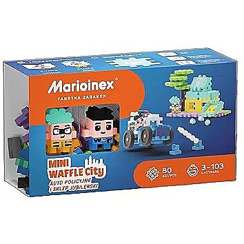 Description - Waffle mini building blocks - Police car and jewellery shop Alarm in the jewellery shop! The cunning Robber Gizmo has robbed the safe of sparkling diamonds! Brave Policeman Chase rides to the rescue. Will he be able to catch the robber with the help of a speedy police car? Or will the robber emerge from the chase unscathed? Build a one-of-a-kind luxury diamond shop in Waffle City. But make sure it's safe, too - valuables like these make valuable loot for robbers. Build Policeman Chase's police car and keep the area safe. One day, out of the blue, Gizmo the Robber will show up and cause a disturbance. The Jewellery Shop set consists of 80 pieces and two unique figurines. Take the role of the heroic policeman and capture the ruthless robber, or choose Gizmo's side and try to avoid the mad pursuit. Combine the set with others from the Waffle City series and expand the town with a jewellery shop and more characters. Assemble the set according to the instructions, or trigger your child's imagination and build your own unique construction!   The Jewellery Shop set combines learning logical spatial thinking with the much-loved fun of policemen and thieves. Heroes of the set: Robber Gizmo a cunning thief who deals in robbing valuables. He is cunning and difficult to catch, although what he doesn't know is that this time he will be up against Policeman Chase. Chase dynamic and fast, a police pursuit master. No villain eludes him. Advantages of the set: Develop your child's imagination and creativity through playing together 100% safe, certified materials Attractive, hours of fun for your children and you! Construct 2D and 3D shapes Bricks made in Poland Bricks and packaging made from recycled, renewable materials For children from 3 years of age Warning Not suitable for children under 36 months. Contains small parts, easy to swallow. This product complies with European standards. Remove the packaging parts before giving the toy to your child. Keep the label as it contains important information. The colours of the elements may differ from those shown on the packaging. Maintenance The toy should be washed under running water with soap.