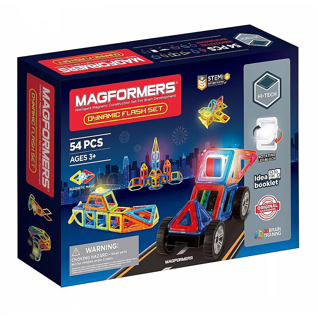 Description - Magformers jest globalnym producentem niezwykłych i oryginalnych klocków magnetycznych, wykonanych z wysokiej jakości materiałów. Każdy klocek zawiera neodymowe magnesy, które silnie się ze sobą przyciągają. Dynamic Flash to produkt, który świetnie sprawdzi się wśród najmłodszych. 54 elementy znajdujących się w opakowaniu pozwala na złożenie wielu trójwymiarowych konstrukcji. Można układać je samodzielnie lub czerpać inspirację z podręcznika dołączonego do zestawu.
