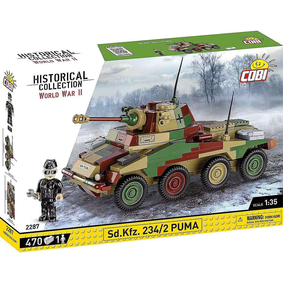Description - We designed the block model of the German heavy armored car Sd.Kfz 234/2 PUMA in the scale of 1:35 using 470 elements. Once built, the vehicle is 20cm long and its size fits both the figures and other vehicles we create in this scale. The vehicle impresses with its very detailed design, camouflage and high-quality prints, which make it a very important entry in the COBI Historical Collection. There are no stickers here, we only use permanent prints. The vehicle has movable elements like wheels, the turret and the cannon. The set also includes a figure depicting a crew member of the armored car. The entire set is complemented by a plate with the vehicle's name on it. The set is a must-have not only for young history enthusiasts, but above all for adult collectors and fans of military technology. Build history, piece by piece, with COBI! Sd. Kfz. The 234/2 Puma was a German armored wheeled vehicle used during World War II. It was equipped with a 50mm cannon placed in a fully armored turret. From September 1943 to September 1944, 101 of these vehicles were produced. The car had a Tatra 103 diesel engine and an impressive maximum speed of up to 90 km/h. Off-road, it performed almost as well as tracked vehicles. 470 high-quality elements Manufactured in the EU by a company with over 20 years of tradition The blocks meet the safety standards of products for children Fully compatible with other brands of construction blocks Blocks with prints do not scratch or smear and do not fade during play or under the influence of temperature Clear and intuitive instructions based on illustrations and step-by-step directions 100% prints, no stickers Soldier figure Historical prints Nameplate Model dimensions (L x H): 20 cm (7.9") x 11 cm (4.3")