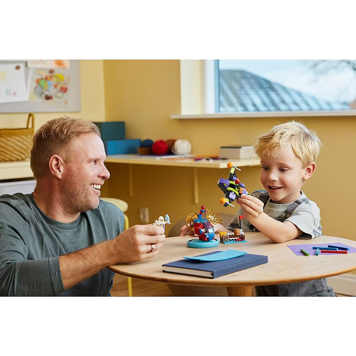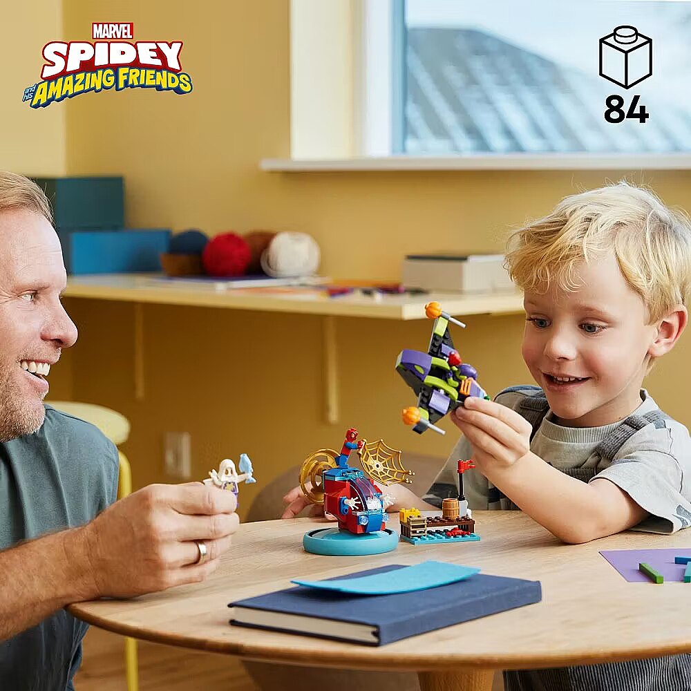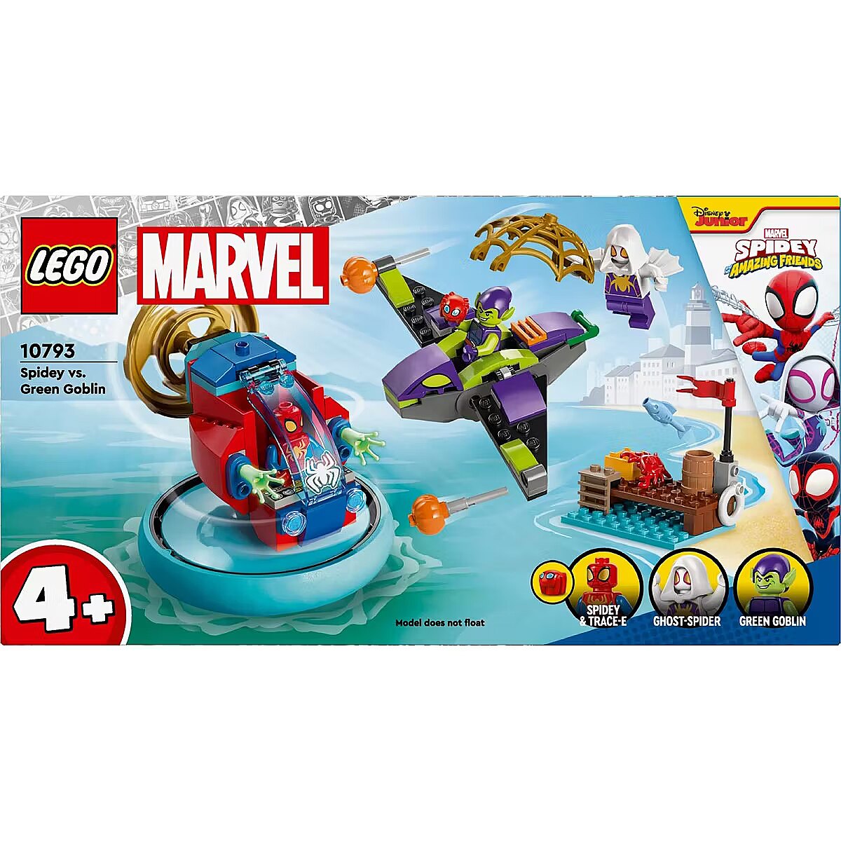 Description - Treat kids to the LEGO 4+ Spidey vs. Green Goblin (10793) Super Hero toy vehicle action set. This Marvel Spider-Man toy is specially designed to build confidence, improve problem-solving skills and inspire kids, boys and girls aged 4+ to enjoy endless imaginative play. This Disney+ Spidey and His Amazing Friends toy vehicle set includes: a Spidey minifigure and his hover spinner with rotating propeller and lift-up cockpit; a Green Goblin minifigure and his glider with pumpkin projectiles; and a Ghost-Spider minifigure with her large, golden web element. Theres also Spideys robot friend Trace-E, sea accessories and a cute crab. The set comes with a cockpit Starter Brick to help get building underway and intuitive instructions in the form of a colourful picture-story guide. Inside the box, each bag contains bricks for a quick-to-build model and character, so play gets started fast. 4+ toys are the perfect way for adults to share building fun with youngsters. Disney+ Spidey and His Amazing Friends toy Spidey vs. Green Goblin toy vehicle set designed to meet the passions and capabilities of young Super Heroes, Spider-Man fans, kids, boys and girls aged 4+ Marvel heroes and vehicle toy set Includes Spidey, Green Goblin and Ghost-Spider minifigures for action play, plus a large Starter Brick to make building quick and fun Movable toys for kids The playset features Spideys hover spinner with rotating propeller and lift-up cockpit and Green Goblins glider toy Spider-Man toys ­ Authentic elements from the TV show include Spideys robot friend Trace-E, pumpkin projectiles, a golden web element, sea accessories and a crab Spider-Man gift for kids With its Starter Brick and simplebuilding steps, you can give this toy vehicle set to any young builder or Super Hero fan Expand the fun Check out the extensive range of compatible LEGO 4+ vehicle toys and LEGO Marvel playsets Preschool buildable toy LEGO sets for 4+ year ol ds introduce children to a universe of movie favorites, TV characters and everyday heroes 4+ vehicle set This portable playset has 84 pieces and Green Goblins glider measures over 1 in. (3 cm) high, 3 in. (8 cm) long and 5.5 in. (14 cm) wide