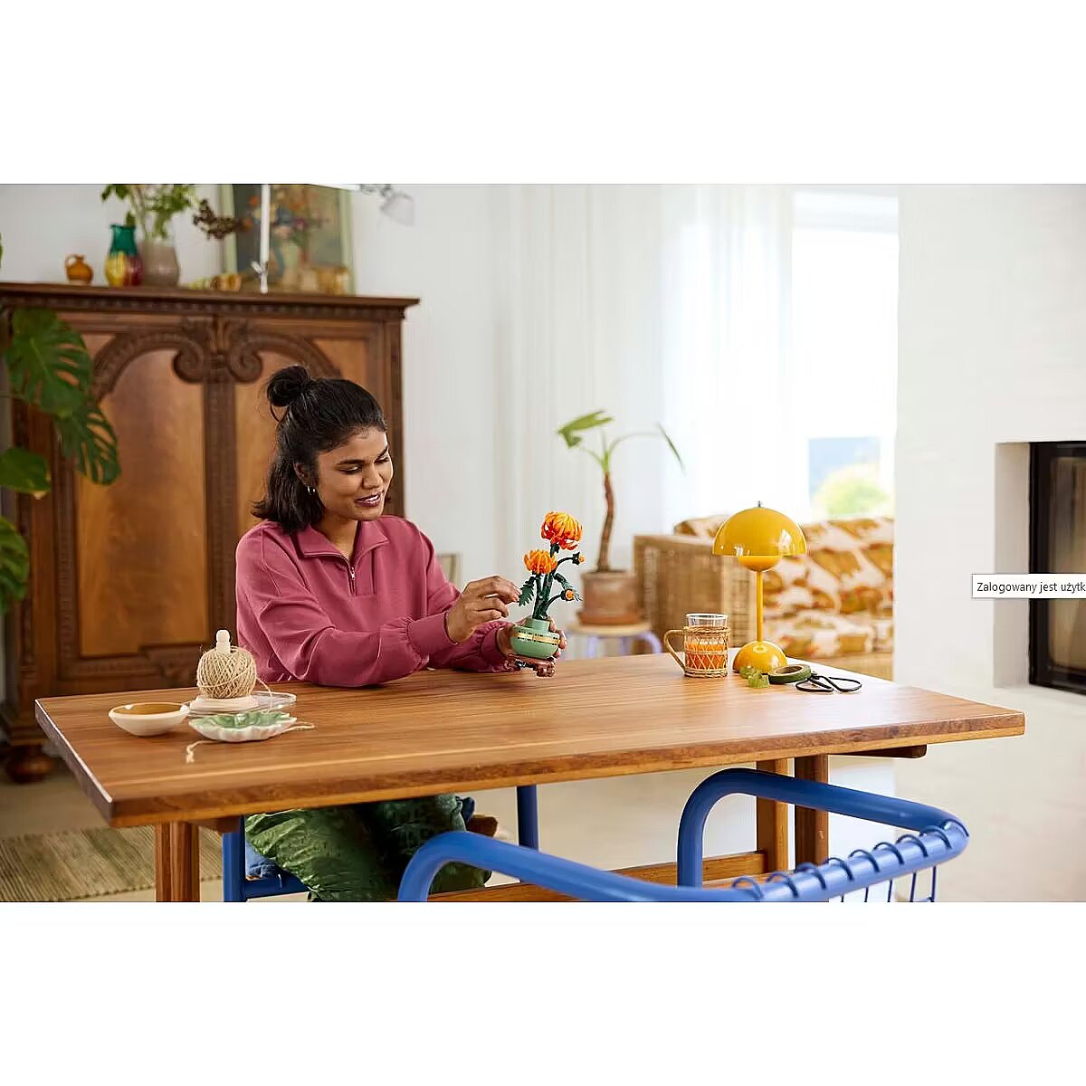 Description - Odpręż się przy zestawie dla dorosłych LEGO Icons Chryzantema (10368). Chryzantema to popularny motyw w sztuce tradycyjnej i symbol jesieni w klasycznym motywie artystycznym, opartym na czterech pięknych roślinach, znanych jako czworo szlachetnych. Rozpocznij ciekawy projekt lub podaruj ukochanej osobie ponadczasową kompozycję kwiatową jako na prezent na każdą okazję. Ta szczegółowa replika z ruchomymi liśćmi i płatkami przedstawia jaskrawopomarańczowy kwiat w formie pąka, rozkwitającego kwiatu i w pełni rozkwitu. Do zestawu dołączona jest pastelowa zielona doniczka ozdobiona złotą obwódką i cokołem z efektem drewna. Łatwy w budowaniu model chryzantemy stanowi elegancką ozdobę każdej przestrzeni i będzie się świetnie prezentować w towarzystwie innych zestawów z kolekcji botanicznej LEGO (sprzedawanych osobno). Odpręż się dzięki inspirującej serii kreatywnych zestawów LEGO dla dorosłych. Aplikacja LEGO Builder zawiera cyfrową wersję instrukcji budowania. Dekoracyjna chryzantema do zbudowania - spraw sobie przyjemność lub dołącz do przyjaciół i rodziny i weź udział w odprężającym projekcie dzięki zestawowi dla dorosłych LEGO Icons Chryzantema Zawartość zestawu - ten kreatywny zestaw zawiera wszystko, czego potrzeba do stworzenia chryzantemy i pastelowej zielonej doniczki ze złotą obwódką i cokołem z efektem drewna Kwitnące pąki - LEGO Icons Chryzantema z ruchomymi liśćmi i płatkami przedstawia jaskrawopomarańczowy kwiat w różnych etapach wzrostu, w tym w pełnym rozkwicie, w formie kwitnącego kwiatu i dwa pąki Ozdoba niewymagająca pielęgnacji - dodaj odrobinę koloru do swojego mieszkania lub biura dzięki chryzantemie w doniczce, której nie trzeba podlewać ani przesadzać Pomysł na prezent - uczcij urodziny lub inną wyjątkową okazję albo zaskocz ukochaną osobę prezentem dla dorosłych fanów zestawów LEGO, dekoracji wnętrz i kwiatów Zawiera cyfrowe instrukcje budowania - aplikacja LEGO Builder zawiera cyfrową wersję instrukcji do zestawu LEGO z kwiatkiem Część kolekcji botanicznej LEGO - zrelaksuj się przy szerokiej gamie zestawów LEGO zaprojektowanych specjalnie dla dorosłych Wymiary - chryzantema z doniczką i cokołem w tym 278-elementowym zestawie ma 26 cm wysokości, 10 cm szerokości i 9 cm głębokości.