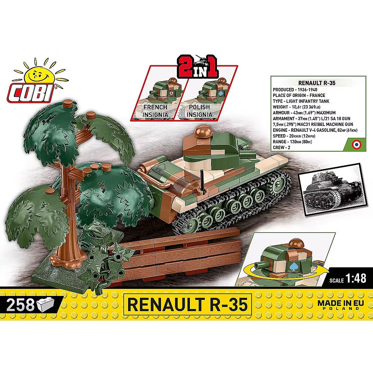 The Renault R-35 was a popular French light infantry tank (Char léger modle 1935R) from the early period of World War II. It was the successor to the aging Renault FT-17, a tank that had served since the Great War. The R-35 featured a modern design and, for its time, good armor protection. However, its disadvantages included an underpowered engine and a one-man turret that forced the commander to handle multiple tasks usually assigned to several crew members in other tanks. The 37 mm gun, also a relic of the Great War, no longer offered high effectiveness.