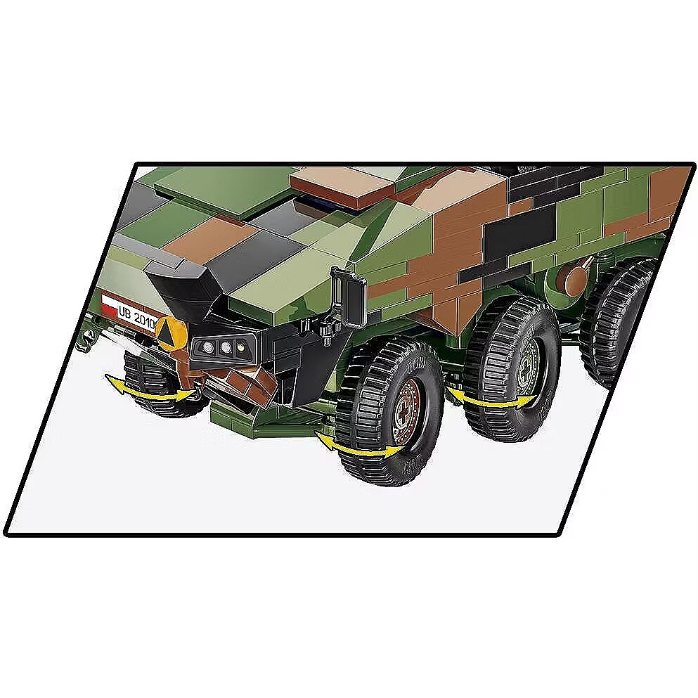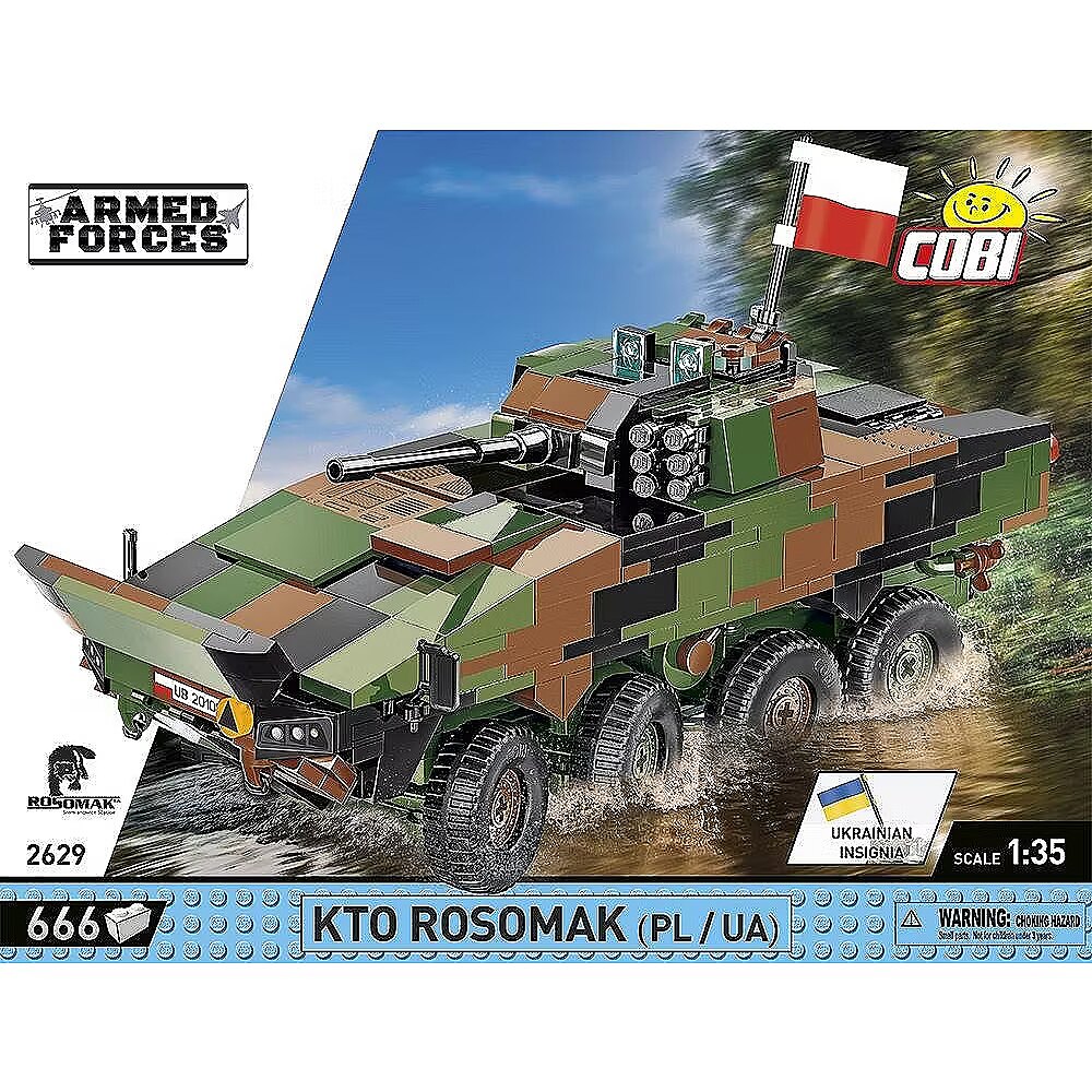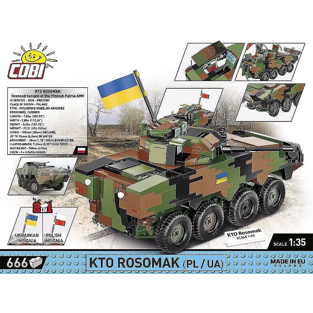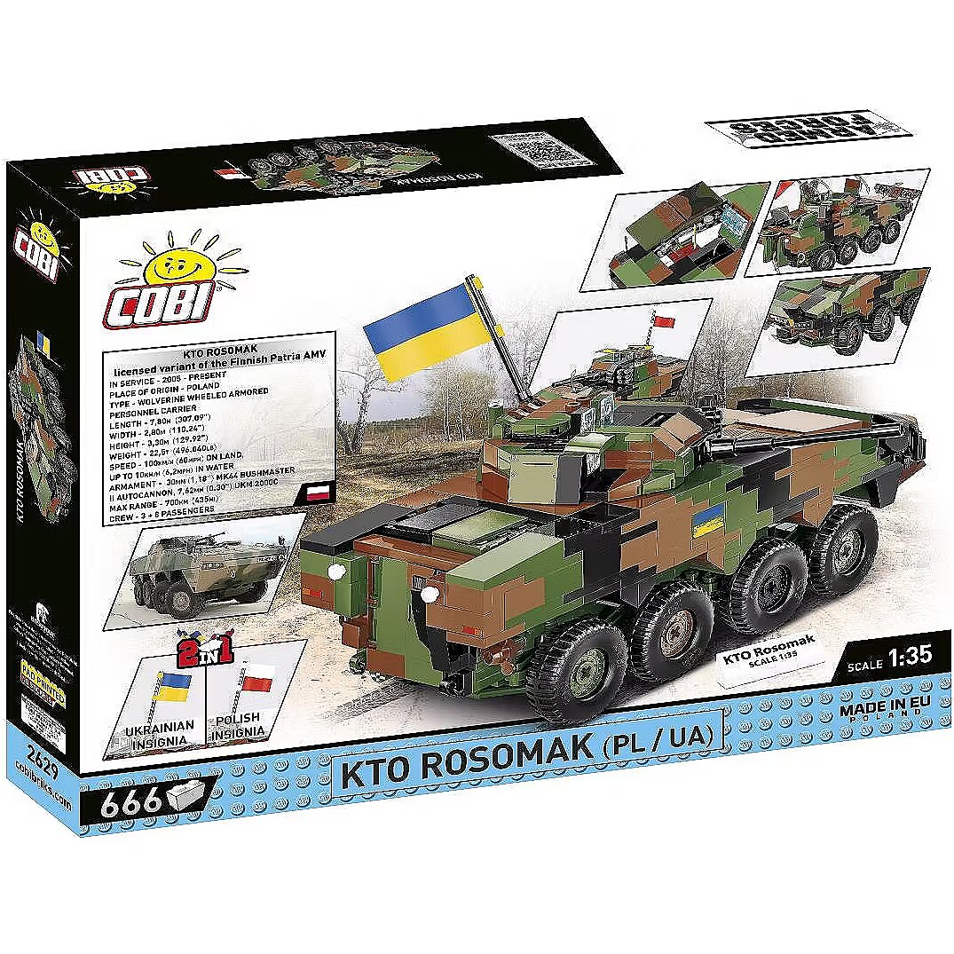 Klockowy model szczegółowo odwzorowany w skali 1:35 doskonale uzupełnia kolekcję pojazdów lądowych wydawanych w ramach serii COBI Armed Forces. Zestaw został wydany na licencji przedsiębiorstwa ROSOMAK SA z Siemianowic Śląskich, gdzie produkowany jest oryginalny pojazd! Model posiada skrętne osie kół, otwierane włazy oraz nadrukowane szczegółowe oznaczenia Wojska Polskiego. Do zestawu dołączone są również dwie klockowe flagi odpowiednio dla krajów, które użytkują tego typu pojazdy (Polska i Ukraina). Klockowa tabliczka zawiera nadrukowaną nazwę pojazdu i można ją wyeksponować obok modelu! Zbuduj współczesny transporter kołowy Wojska Polskiego! Wyprodukowane w UE przez firmę z ponad 35-letnią tradycją Spełniają normy bezpieczeństwa dotyczące produktów dla dzieci W pełni kompatybilne z innymi markami klocków konstrukcyjnych Zastosowano tylko trwałe nadruki bez użycia naklejek Czytelna i intuicyjna instrukcja oparta na rysunkach i ikonach Skala 1:35