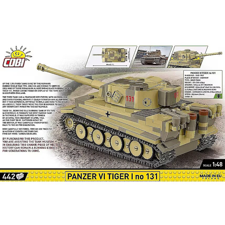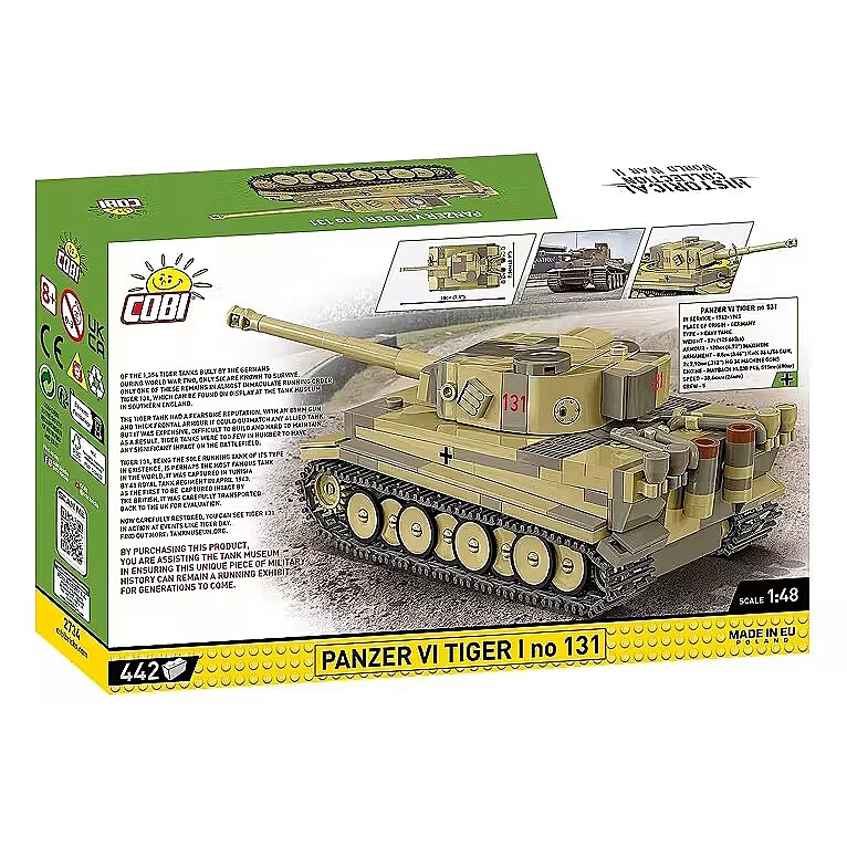 Description - PANZER VI TIGER I no 131 to jedyny na świecie sprawny egzemplarz niemieckiego czołgu Tiger I. Znajduje się w The Tank Museum w Bovington, gdzie każdego roku przyciąga tysiące pasjonatów historii militarnej. Teraz Ty możesz zbudować i oglądać codziennie ten legendarny pojazd w skali 1:48 i to bez wychodzenia z domu! Panzerkampfwagen VI Tiger I to niemiecki czołg ciężki z okresu II wojny światowej, znany z potężnego działa kal. 88 mm, solidnego opancerzenia oraz budzącego respekt wyglądu. Po raz pierwszy pojawił się na froncie w 1942 roku, od razu wzbudzając grozę w szeregach aliantów. Model Tiger 131 to jeden z najbardziej znanych egzemplarzy tego typu zdobyty przez Brytyjczyków w Tunezji w 1943 roku i zachowany w niemal oryginalnym stanie. Dziś pełni funkcję eksponatu muzealnego, regularnie prezentowanego podczas pokazów historycznych pojazdów wojskowych. Ten miniaturowy Tygrys to część specjalnej serii modeli pancernych od COBI. Pomimo kompaktowych rozmiarów robi ogromne wrażenie a dzięki skali 1:48 możesz tworzyć całą kolekcję, nie martwiąc się o brak miejsca na półce! Najważniejsze cechy modelu PANZER VI TIGER I no 131 Powstał we współpracy z The Tank Museum w Bovington - Model opracowany przy współudziale muzeum, co gwarantuje historyczną wierność i dbałość o detale zgodne z oryginałem. Skala 1:48 - Klasyczna modelarska skala zapewnia doskonały balans między szczegółowością a kompaktowym rozmiarem. Umożliwia wierne odwzorowanie proporcji pojazdu przy zachowaniu jego funkcjonalności i estetyki. 442 elementy - Zestaw zawiera 442 wysokiej jakości klocki, co czyni model szybkim do złożenia, a zarazem solidnym i bogatym w detale. Nowy kamuflaż - Nowa wersja czołgu została wyposażona realistyczny kamuflaż, odtworzony dzięki zastosowaniu nowego koloru klocków, inspirowanego autentycznym wyglądem czołgu Tiger 131 z muzeum. Realistyczne nadruki dodatkowo podkreślają jego historyczny charakter. Ruchome elementy i trakcja gąsienicowa - Wieża obraca się w pełnym zakresie, a działo można unosić i opuszczać, co pozwala na realistyczne przedstawienie czołgu w różnych pozycjach bojowych. Funkcjonalna trakcja gąsienicowa umożliwia płynne poruszanie się modelu po różnych powierzchniach.  Wysokiej jakości nadruki - bez naklejek! - Wszystkie oznaczenia i detale graficzne naniesiono trwałym nadrukiem odpornym na ścieranie, który zachowuje intensywność kolorów nawet przy częstym użytkowaniu. Kompaktowa forma - Model idealnie nadaje się do kolekcjonowania, przechowywania i eksponowania. Świetnie sprawdzi się także jako element dioram historycznych czy edukacyjnych wystaw. Prosty proces budowy - Instrukcja dołączona do zestawu posiada ikony i ilustracje, które przeprowadzą Cię przez proces budowy krok po kroku. Dzięki temu składanie modelu jest łatwe i przyjemne, nawet dla osób bez doświadczenia w układaniu klocków konstrukcyjnych. Szeroki wybór - Sprawdź inne pojazdy z serii HISTORICAL COLLECTION: World War II i twórz własną kolekcję wspaniałych maszyn! Model Tiger 131 w skali 1:48 to wyjątkowe połączenie historii, techniki i dobrej zabawy. Dzięki precyzji wykonania i wiernemu odwzorowaniu staje się nie tylko modelem do złożenia, ale również symbolem jednej z najbardziej ikonicznych maszyn wojennych XX wieku. Dołącz do grona pasjonatów, zbuduj własnego Tygrysa i poczuj dumę z tworzenia czegoś naprawdę wyjątkowego! 442 wysokiej jakości elementy Wyprodukowane w UE przez firmę z ponad 35-letnią tradycją Produkt na oryginalnej licencji The Tank Museum w Bovington Spełniają normy bezpieczeństwa dotyczące produktów dla dzieci W pełni kompatybilne z innymi markami klocków konstrukcyjnych Czytelna i intuicyjna instrukcja oparta na rysunkach i ikonach Skala 1:48