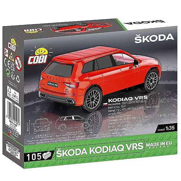 Description - A mid-range SUV produced under the Czech Škoda brand. The Kodiaq VRS model was unveiled at the Paris Motor Show in October 2018. It is the fastest Kodiaq and the most expensive Škoda available in the family. It includes Škoda's most powerful diesel engine, a 2.0-litre bi-turbo diesel engine. The Kodiaq has a more aggressive design and sportier trim. From 2019, the British police are using the Škoda Kodiaq vRS as their police car. The name Kodiaq refers to the Kodiak bear that lives on Kodiak Island off the southern coast of Alaska. The 1:35 scale model composed of 100% COBI bricks very faithfully reproduces the characteristic shapes of the original Skoda Kodiaq car. The bricks feature permanent prints that do not rub off even during intensive use. The rotating wheels equipped with tyres are ideal for moving the model around during play. The COBI building block model will be loved not only by children, but also by mature building block fans, collectors and motoring enthusiasts. 105 high-quality elements Manufactured in the EU by a company with over 20 years of tradition Meets safety standards for children's products Fully compatible with other building block brands Printed bricks do not deform or fade during play or when exposed to temperature Clear and intuitive instructions based on drawings and icons