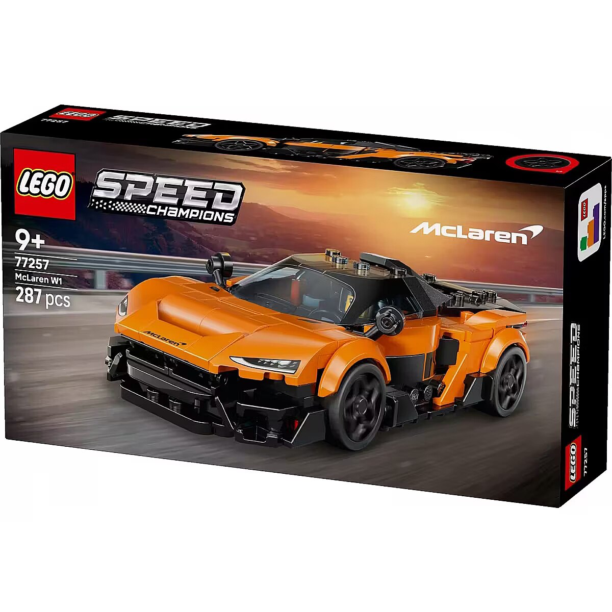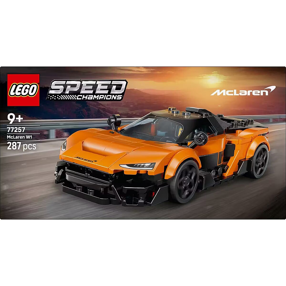 Description - Blocks Speed Champions 77257 McLaren W1 With the LEGO Speed Champions McLaren W1 supercar replica (77257), boys and girls aged nine and up can enjoy super-fast action. Kids can build and display the sleek racing car, as well as use it to stage exciting races. The car features plenty of authentic design details from the real-life version, released to celebrate the 50th anniversary of McLarens first Formula 1 World Championship victory. This McLaren car model includes an adjustable rear wing for road or race mode, a rear-mounted engine, a cockpit, an onboard computer display, and air intakes on the sides and hood. The set also comes with a driver minifigure wearing a McLaren outfit, complete with a helmet, hair, and a wrench that can also be used for applying stickers and separating bricks. LEGO Speed Champions building sets allow kids to build replicas of many iconic vehicles and also make a great gift idea. Children can build with confidence using the LEGO Builder app, where they can zoom in on models, rotate them in 3D, and track their progress with simple digital instructions. The set consists of 287 pieces.