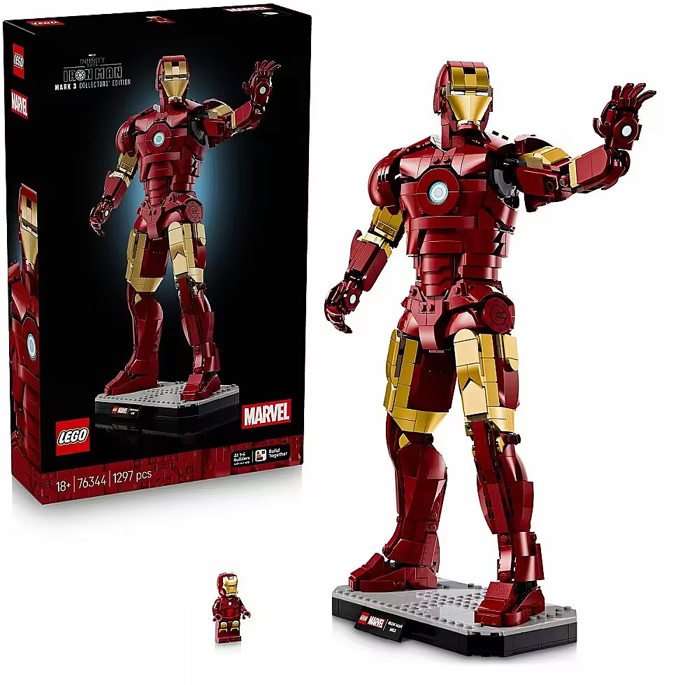 Description - Adult fans of Super Hero action can recreate Iron Mans appearance in Marvel Studios Avengers: Infinity Saga with the LEGO Marvel Iron Man Mark 3 Collectors Edition (76344) figure. This impressive, 1,297-piece building set stands over 15 in. (38 cm) tall, making it a great birthday or any-day gift for men, women, Iron Man Fans and LEGO lovers ages 18 and older. Put the authentically detailed Iron Man Mark 3 armor into dynamic display poses by repositioning the jointed neck, waist, shoulders, wrists and hands. The LEGO Marvel figure is decorated with gold-lacquered accents and stands on a sturdy base with a name plaque, creating a stunning piece of Super Hero decor. As an extra treat, theres also an Iron Man minifigure included, also ready for action in his Mark 3 armor. Builders can download the LEGO Builder app for a collaborative Build Together experience with friends and family. Building set contains 1,297 pieces. RON MAN BUILDING SET Adult fans can indulge their passion with LEGO Marvel Iron Man Mark 3 Collectors Edition (76344), a posable display figure standing over 15 in. (38 cm) tall