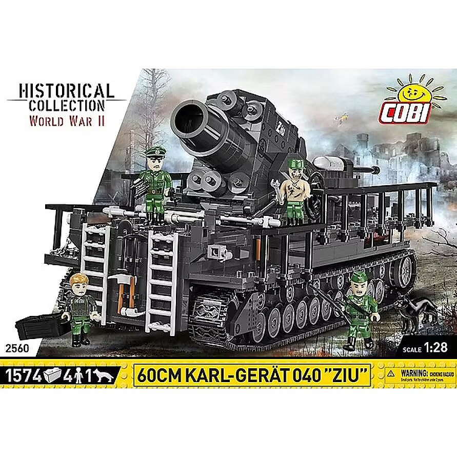 Description - The 60cm Karl-Gerät 040 was the heaviest self-propelled mortar used during the Second World War. It was equipped with a huge 60cm gun. The Germans managed to produce only a few of them during the war. Karl Gerät number 6, dubbed "Ziu", was used to fire at Warsaw during the 1944 Uprising. The model made of COBI construction blocks has many movable elements such as rotating wheels and working tracks, a movable gun barrel and a loading system. The new release is an improved design and has even more details. The set includes four figures and a dog. They are an officer, service soldier, mechanic and gendarme. The figures received a set of completely new legs with high officer's boots. The gendarme is equipped with a new accessory depicting the equipment of a German soldier. The whole set is completed by a brick with the name of the mortar "ZIU" printed on it, which is installed on the model. The set also includes a plate with the name of the set. The Karl-Gerät set will give you many hours of exciting building of this amazing piece of history. The realistic block model is the perfect purchase for an enthusiast of military history and technology. Due to its large size and detail, Karl-Gerät will surely become the pride of many collections and an impressive display model! 1,574 high-quality blocks Produced in the EU by a company with over 20 years of tradition The blocks meet the safety standards of products for children Fully compatible with other brands of construction blocks Blocks with prints do not scratch or smear and do not fade during play or under the influence of temperature Clear and intuitive instructions based on illustrations and step-by-step directions 100% prints, no stickers 4 figures of German soldiers and a dog of the Field Gendarmerie A block with the name of the set
