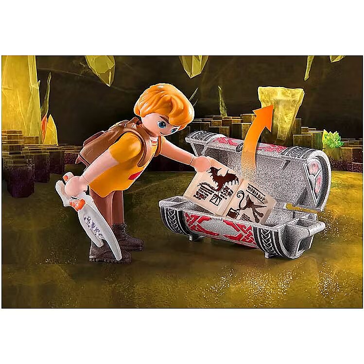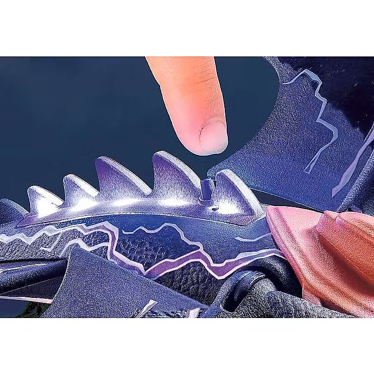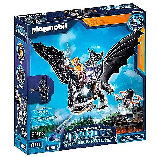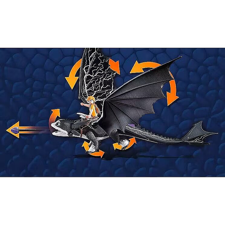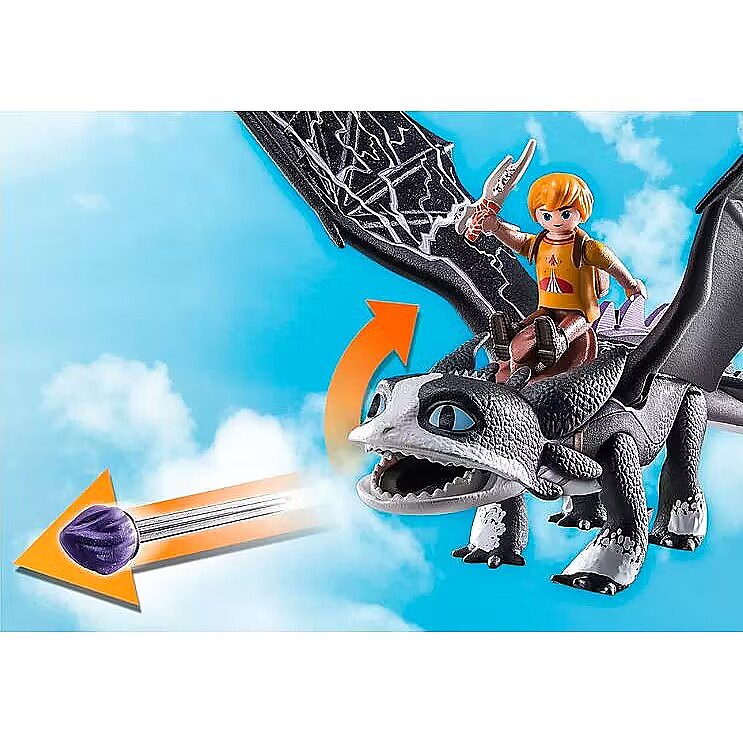 Description - Set 1,300 years after the events of How To Train Your Dragon, dragons are now just a legend to the modern world. When a geological anomaly opens up an immense, miles-deep in the Earths surface, scientists from all over the world gather at a new research facility to study the mysterious phenomenon. Soon a group of misNOt kids, brought to the site by their parents, uncover the truth about dragons and where theyve been hiding a secret they must keep to themselves to protect what theyve discovered. Tom is a smart, young adventurer. Raised by his scientist mom, her curious nature has rubbed off on him. Tom has an impulsive need to explore and check things out - but sometimes forgets to consider the consequences. Tom's dragon is Thunder.  With the Thunder & Tom playset from PLAYMOBIL, you can now bring the dragon fun home. Thunder can move all four legs as well as his head and wings. The integrated saddle allows Tom to ride on Thunder. The back scales of Thunder feature a light module and he can shoot plasma arrows out of his mouth. This is done by inserting an arrow into the dragon's mouth and then closing it. By pushing down the head or ears, the arrow is shot out of the mouth again.