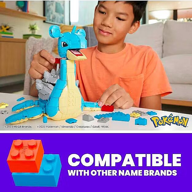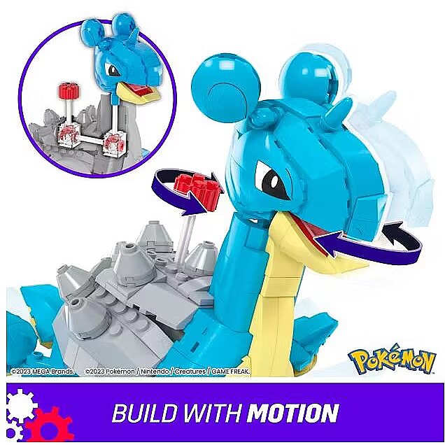 Description - Lapras, the impressive transport Pokémon, is now available as a buildable set with movement. The built model stands 7 inches tall to show Lapras' enormous scale. Turn the crank on the shell to move its head left and right and watch Lapras swim. Lapras is a great addition to your Pokémon collection and combines well with other MEGA building sets; each sold separately. 527-piece construction set including a moving block: turn the crank to activate Lapras movement A mechanized, highly detailed buildable Lapras that stands 7 inches tall Lapras' head moves left and right as you turn the crank The pieces connect to all MEGA Pokémon building sets and are compatible with other brands Officially licensed by The Pokémon Company International