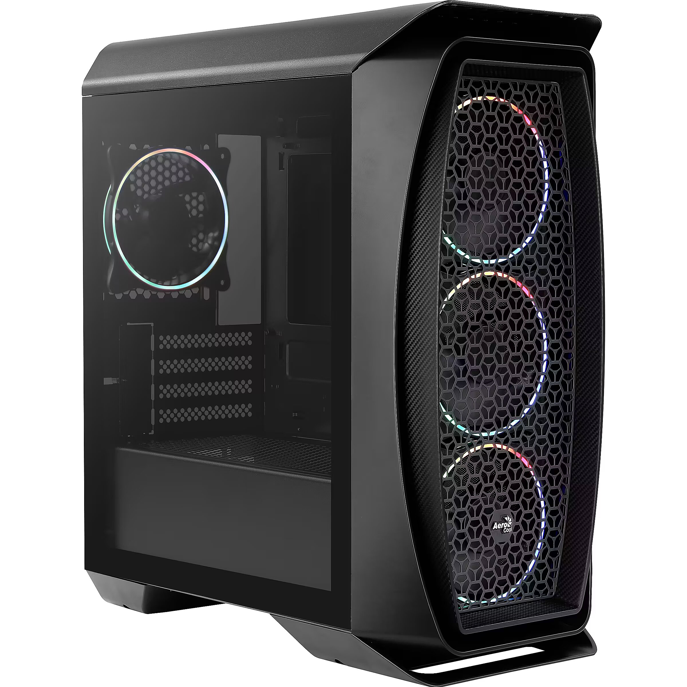 LongDesc - High-performance mini tower case with full tempered glass side panel to showcase the inside of your rig. Mesh front panel design allows for viewing of your front LED fans while providing superior air flow and circulation.Comes equipped with three 12cm Addressable RGB fans in the front and one 12cm Addressable RGB fan in the rear of the case. Addressable RGB fans can be controlled using one of two ways: RGB LED control button or Addressable RGB motherboard. 6-Port RGB Control Hub allows you to connect your ARGB fans or accessories.ADDRESSABLE RGB COMPATIBLETake full control of your Addressable RGB fans using one of two ways:- RGB LED control button on top of the case- Addressable RGB motherboardFOUR ADDRESSABLE RGB FANS INCLUDEDComes equipped with three 12cm Addressable RGB fans in the front and one 12cm Addressable RGB fan in the rear of the case.COMES EQUIPPED WITH ECLIPSE 12 FANSEquipped with Dual Slim Ring Lighting Design with LED rings as thin as 2mm, the Eclipse 12 delivers a sleek and stylish flair while delivering superior cooling capabilities.6-PORT RGB CONTROL HUBFeatures a 6-port hub with PWM control functions and allows you to connect up to six 6-Pin AeroCool Addressable RGB fans and up to two 3-Pin Addressable RGB accessories with +5V ARGB connector.Access 16.8 million colors using compatible Addressable RGB motherboard (Asus Aura Sync, MSI Mystic Light Sync, and Gigabyte RGB Fusion).PWM COMPATIBILITYPlease check if the 4-Pin fan header on your motherboard is PWM compatible.- PWM based – PWM compatible- Voltage based – not PWM compatibleADDRESSABLE RGB RECEPTOR CABLE INCLUDEDComes with a receptor cable to connect your hub with compatible Addressable RGB motherboards.- ARGB MB Connector (For all other ARGB MBs such as ASUS, MSI, etc.)- ARGB MB Connector (Gigabyte RGB Fusion)- 4-Pin Hub Connector- PWM 4-Pin ConnectorPOWER CABLE INCLUDEDComes with a cable to power the hub.- SATA Power Connector- 4-Pin Hub Power ConnectorMESH FRONT PANEL DESIGNFeaturing a unique and stylish mesh front panel design, this case allows for clear viewing of your front LED fans while providing superior air flow and circulation.FULL TEMPERED GLASS SIDE PANELComes equipped with a full tempered glass side panel to properly showcase the inside of your rig.DUAL CHAMBER DESIGNBuilt with a dual chamber design to direct heat away from the main chamber for more effective all-around cooling.COOLING FOR YOUR GRAPHICS CARDVGA fan bracket design supports graphics card cooling: 2 x 120mm fans for superior VGA cooling.AIR COOLINGSupports air cooling in the front, top, and rear of the case to enhance cooling performance.- Front: 120mm x 3 or 140mm x 2 (Includes 120mm Eclipse Fan x 3)- Top: 120mm x 2 (Optional)- Rear: 120mm x 1 (Includes 120mm Eclipse Fan x 1)- Supports VGA Fan: 120mm x 2 (Optional)LIQUID COOLINGSupports liquid cooling in the front, top, and rear of the case for maximum efficiency cooling.- 120/240mm Radiator (Optional)- Top: 120/240mm Radiator (Optional)- Rear: 120mm Radiator (Optional)BUILT FOR HIGH PERFORMANCE- Supports Micro-ATX and Mini-ITX motherboards- Supports CPU coolers up to 161mm- Supports high-end graphics cards up to 327mmCONVENIENT ACCESS TO YOUR MEDIAQuick and easy access to LED control button, 2 x USB 3.0, HD audio and mic ports, and power button.STORAGE CAPABILITYSupports up to 2 x 3.5” HDDs (1 x 3.5” and 1 x 2.5”/3.5”) and 3 x 2.5” SSDs (2 x 2.5” and 1 x 2.5”/3.5”).EASY MAINTENANCERemovable dust filters on the front, top, and bottom of the case for fast and convenient cleaning.