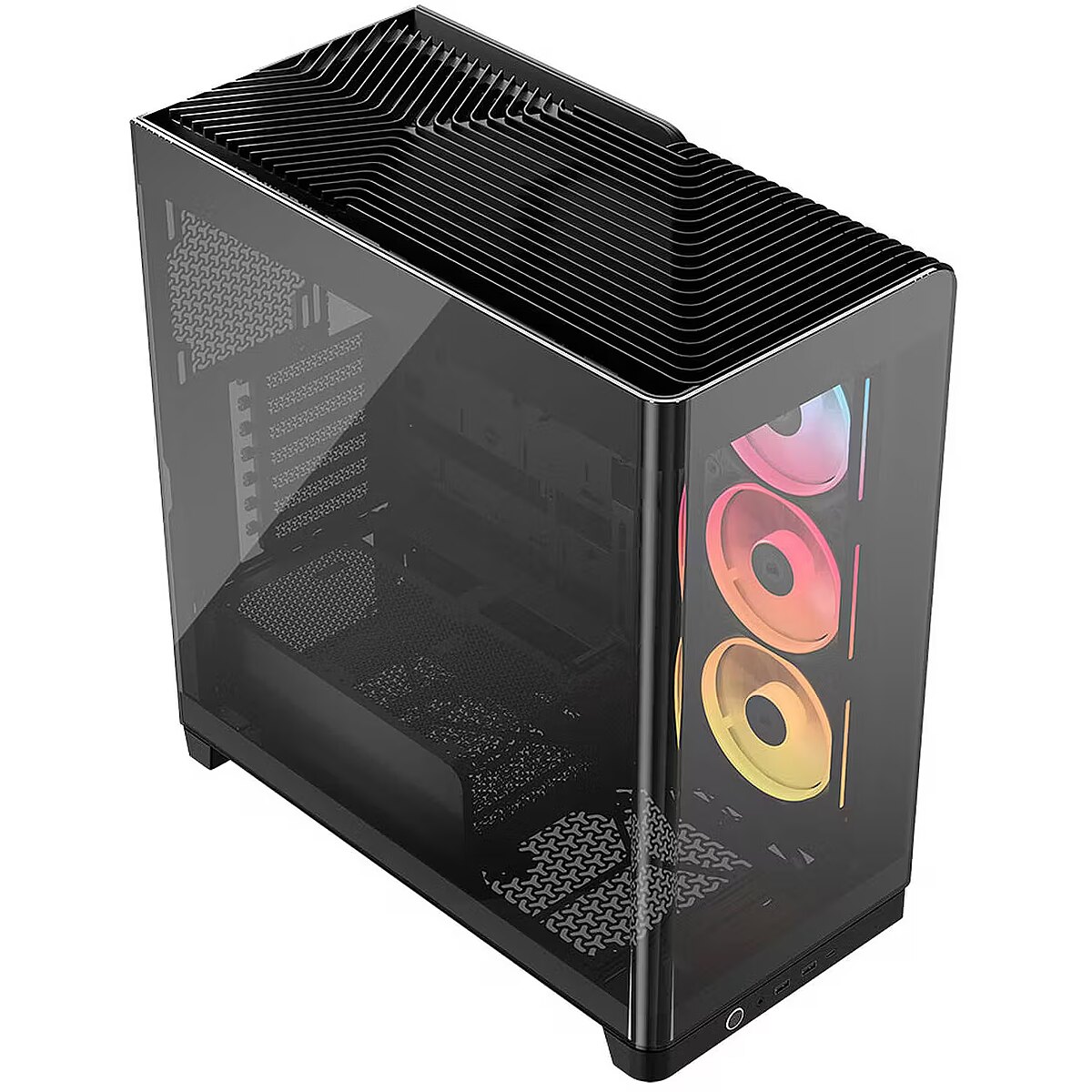 Wentylatory wlotowe iCUE LINK LX-R RGB z odwróconym wirnikiem oferują łatwą łączność za pomocą jednego kabla, niezakłócone oświetlenie RGB i ciche chłodzenie. Świeże powietrze jest wciągane przez wentylowany bok do przestronnej obudowy mid-tower, zapewniając efektywne chłodzenie i duży przepływ powietrza w celu zapewnienia maksymalnej wydajności.