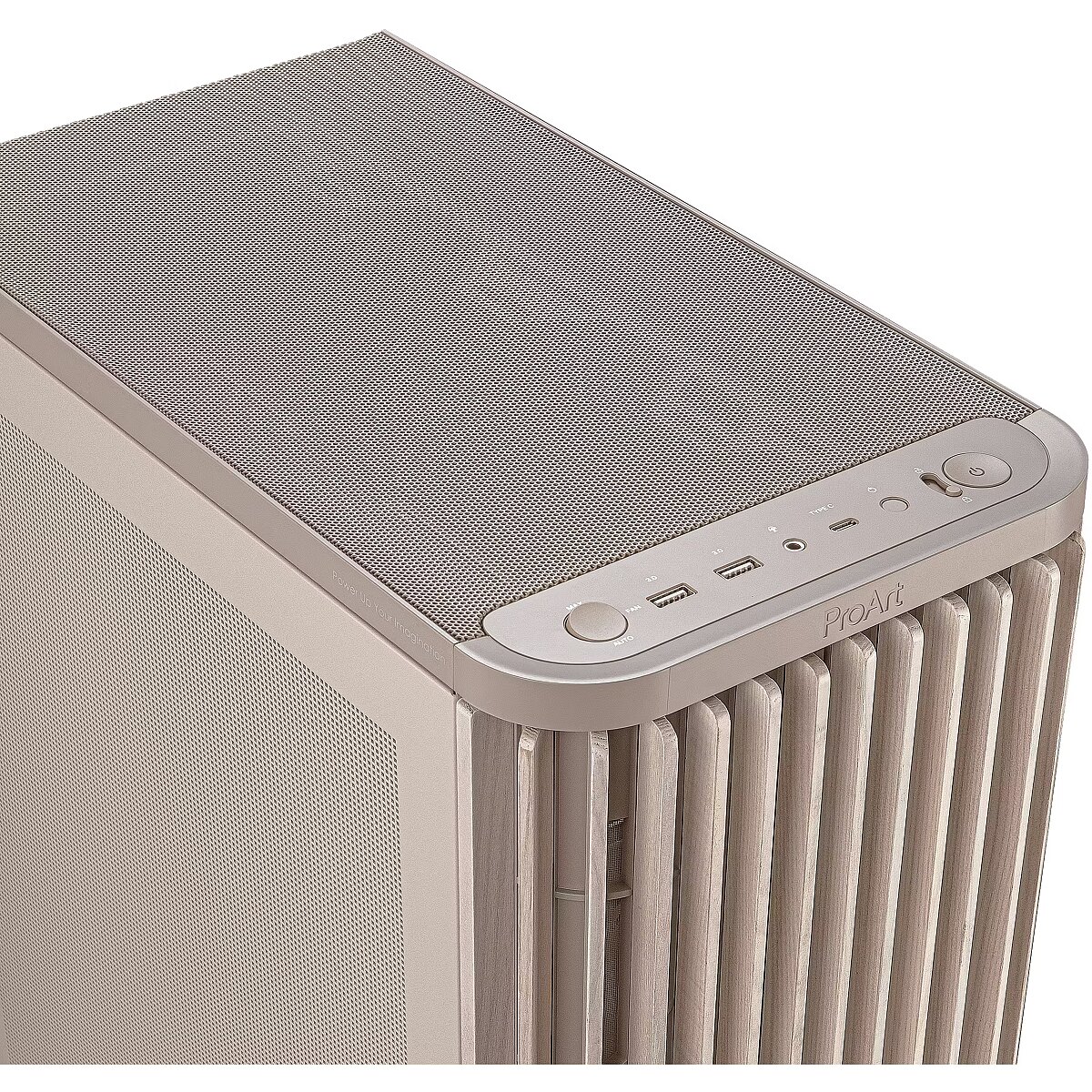LongDesc - ProArt PA401 Wood Edition Mesh PanelNatural Elegance, Optimal AirflowThe ProArt PA401 Wood Edition showcases a wooden front panel that creates a distinctive, elegant style while promoting sustainability. The wood used is certified by the Forest Stewardship Council® (FSC®), and is finished using a six-stage process. The case also boasts optimal built-in cooling, with two 160mm front fans and one 120mm rear fan, along with an integrated fan hub, enabling optimal airflow.