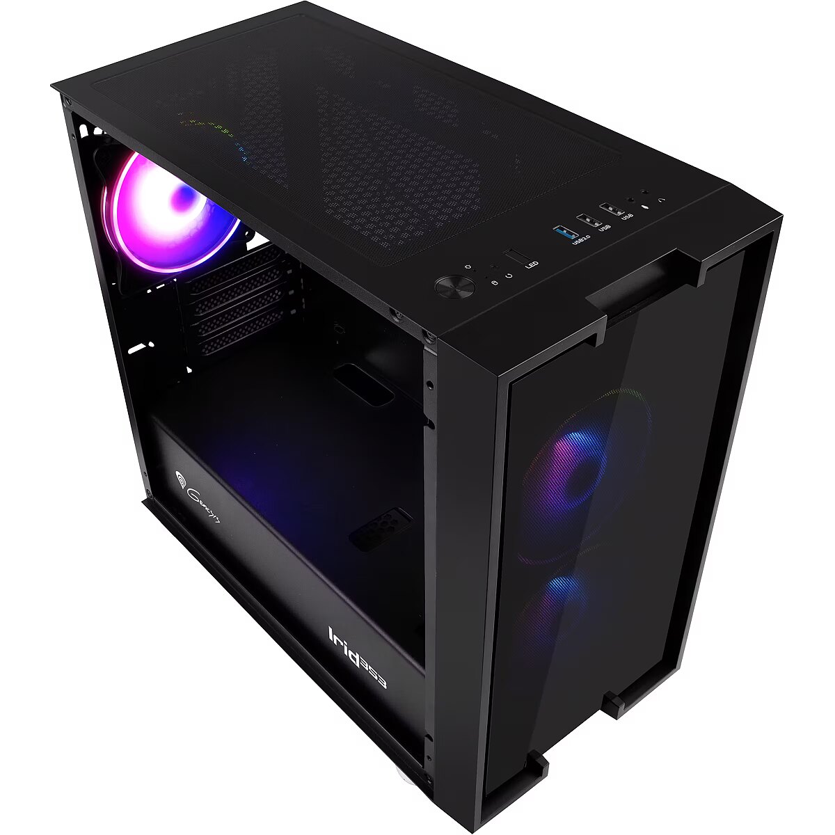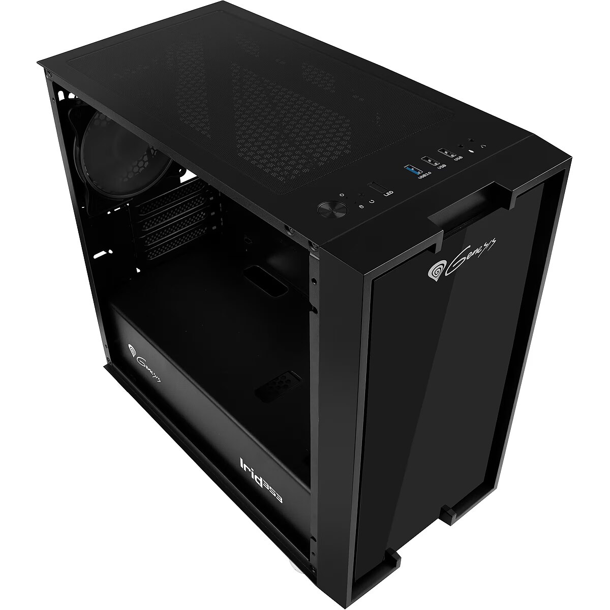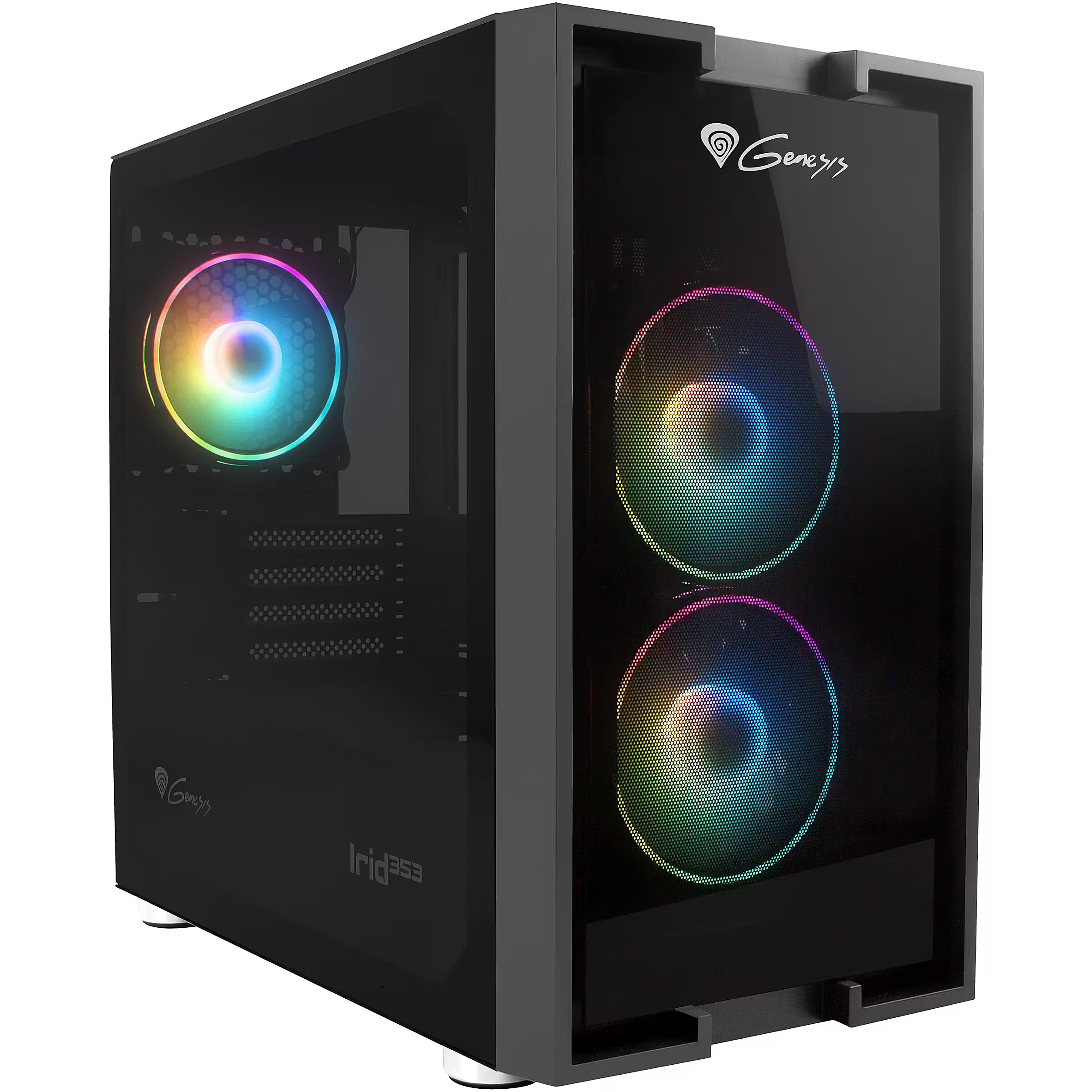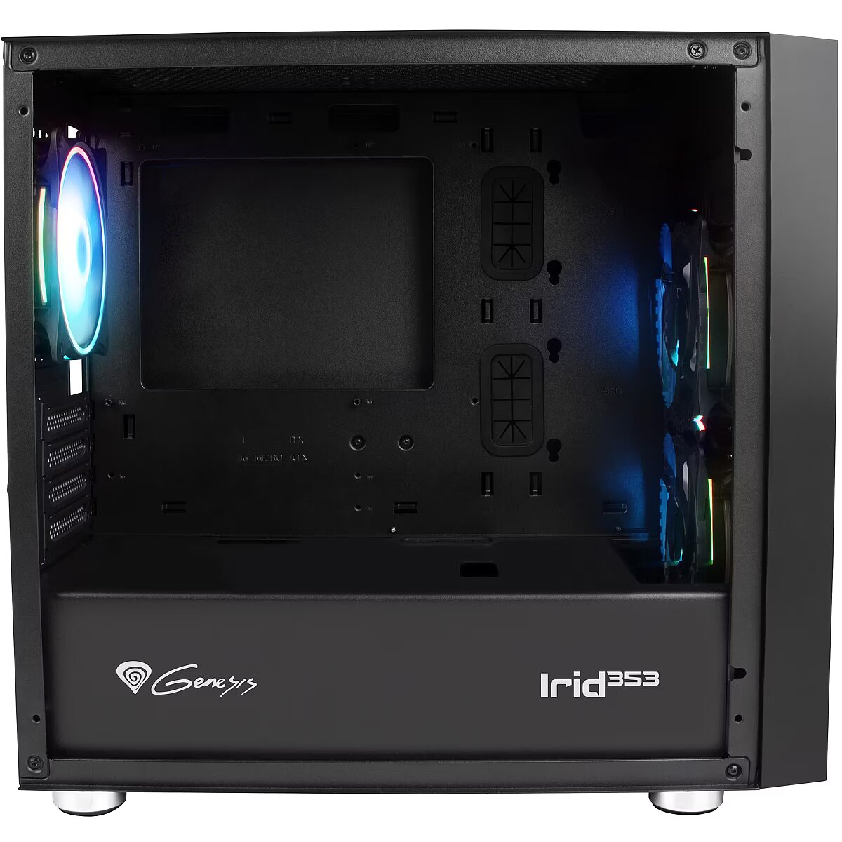 LongDesc - FABULOUS DESIGNThe tempered glass side panel with stylish black decorations covering structural openings, combined with 3 ARGB lighting fans, transforms a regular PC case into a decorative piece.3 ARGB FANS INCLUDEDIf want to be able to rest assured that your PC is running optimally, its hardware components must have the temperature conditions they need. Your mutual comfort is provided by three high-quality, very quiet 120 mm fans with ARGB lighting. If need be, the case can fit more fans - including 140mm!FANS WITH 3-PIN ARGB CONTROLLEREvery fan included with the Irid 353 ARGB as well as the controller itself have 3-pin 5V ARGB plugs, allowing you to connect the controller to a compatible* motherboard and control the backlight effects. The controller, when not connected to the motherboard, allows for independent backlight adjustment, and is additionally equipped with a 4-pin PWM plug, allowing for fan speed adjustment depending on the system load.* The ARGB system (5V 3-PIN) is not the same as RGB (12V 4-PIN). Make sure what type of backlighting your disc supports.INSTALL AS MANY AS THREE SSD'SIrid 353 ARGB gives you enough space for as many as three SSDs, so that you never have to worry about running out of quick-access data. In addition, you have enough space for two standard HDDs.TWO TYPES OF MOTHERBOARD? - NO PROBLEM!The case is compatible with 2 motherboard size variants. You can easily fit a Mini-ITX and Micro-ATX inside without worrying about finding matching components.FUNCTIONAL USB 3.0 PANELFor maximum comfort of use, the top of the case comes with as many as three USB ports, including one USB 3.0 port. We have conveniently placed two jacks close to you, so that you can easily plug in your headphones and microphone. All this in addition to a button controlling the phenomenal ARGB lighting, so that you can set it to as you like it.A CASE WHERE YOU CAN EFFECTIVELY MANAGE YOUR CABLESTo ensure that the interior looks great through the glass pane, you have a lot of space behind the motherboard tray to work with, as well as many rubber grommets which make managing cables easy, preventing them from getting in the way and ruining the aesthetic.SLOT-IN MECHANISM FOR DRIVESWe wanted to ensure maximum comfort of use, which is why you can simply slot in your drives. This simple mechanism enables you to install and uninstall SSDs and HDDs without having to break out the tools again. The panels are simply slid into the housing frame and then tightened with two screws.EQUIP IT WITH LIQUID COOLING UP TO 240 MMDespite the small size, we want you to give you as much freedom as possible. If needed, you can install a liquid cooler up to 240 mm! Irid 353 ARGB offers complete freedom when it comes to hardware and a wide range of cooling options.ALWAYS-STYLISH EXTENSION PORTSWith Irid 353 ARGB, everything will always look stylish and phenomenal. The plugs of the expansion sockets are screwed on, not broken off, allowing them to be reassembled if necessary. Just open what you need and turn it off when the socket is empty.3 DUST FILTERSGenesis Irid 353 ARGB offers a clean environment inside the case for a long time. The set includes three dust filters to ensure maximum order. The Irid 353 has been designed with attention to every detail, ensuring long-term user satisfaction.
