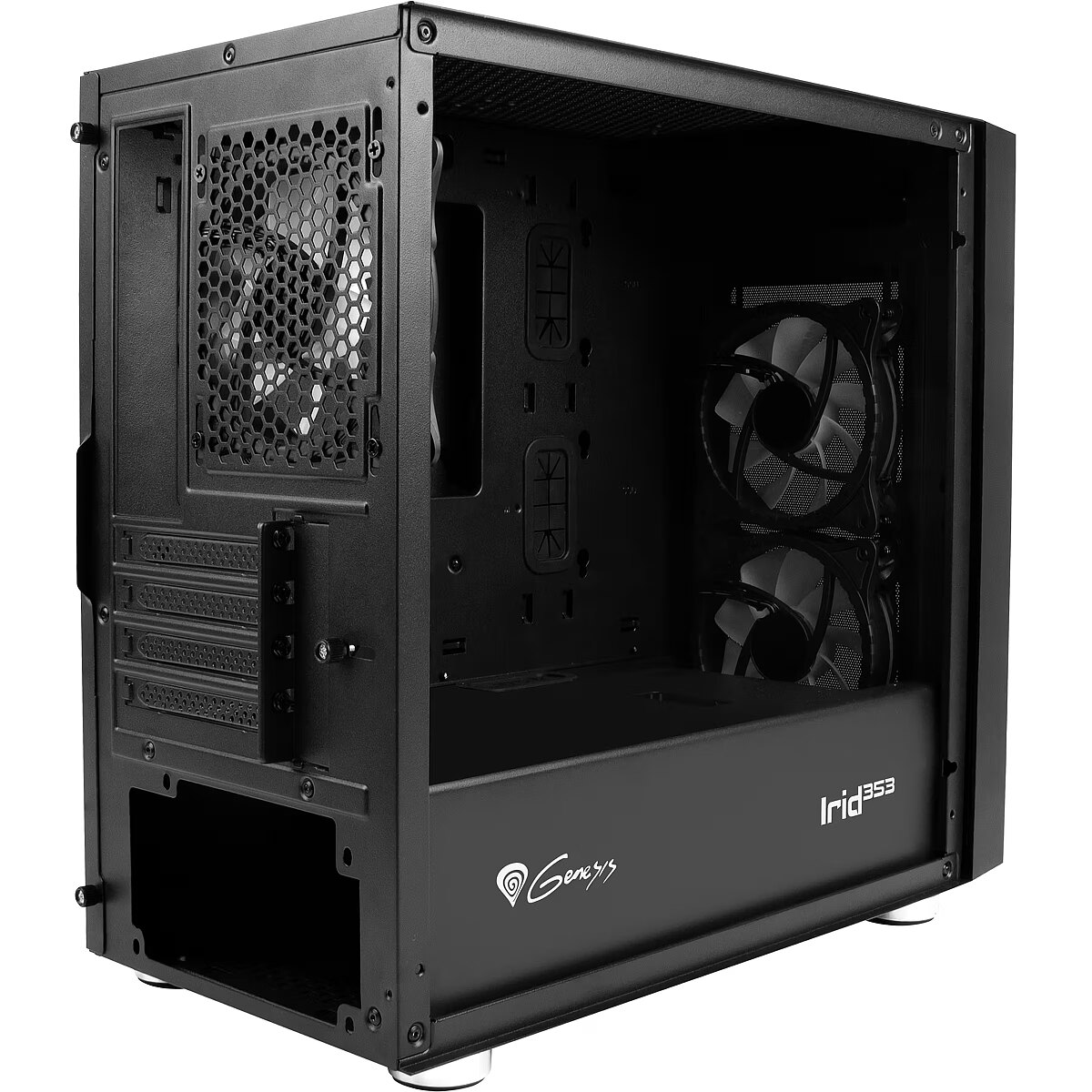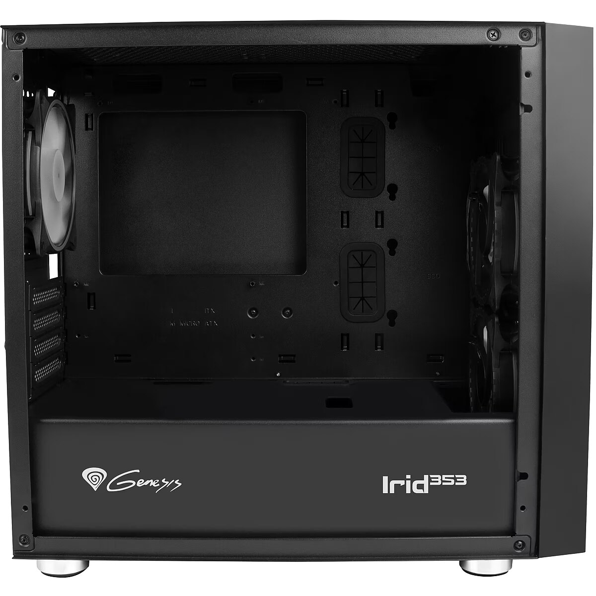 LongSummaryDescription - GENESIS Irid 353 ARGB. Form factor: Micro Tower, Type: PC, Product colour: Black. Power supply location: Bottom. Front fans installed: 2x 120 mm, Front fans diameters supported: 120,140 mm, Rear fans installed: 1x 120 mm. Supported HDD sizes: 2.5,3.5". Width: 210 mm, Depth: 429 mm, Height: 393 mm