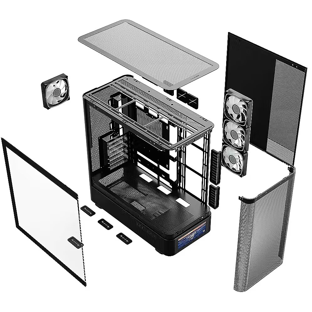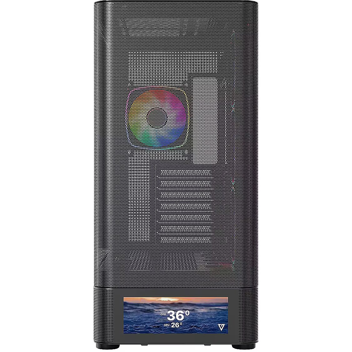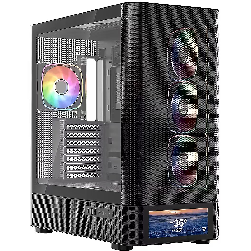 Description - PC case Volcano AQ500 ARGB MIDI BLACK The MODECOM Volcano AQ500 ARGB MIDI is a representative of the Volcano AQ case series, characterized by an eye-catching design with rounded shapes of the front panel (in this case, a perforated metal panel), support for installing motherboards with reversed connectors, four 120 mm ARGB fans included as standard with an ARGB lighting controller, and support for water-cooling radiators up to 420 mm, as well as numerous perforations on the side panels to ensure efficient cooling performance. A distinctive feature of the AQ500 version is the LCD screen built into the front of the case, which allows users to display images, play videos in MP4 format, or monitor the temperature and workload of the processor, graphics card, and RAM usage. All these features are complemented by two USB 3.0 ports and one USB-C port (USB 3.2 Gen 2). This is a case designed to showcase components and personalize the computer to suit individual preferences.