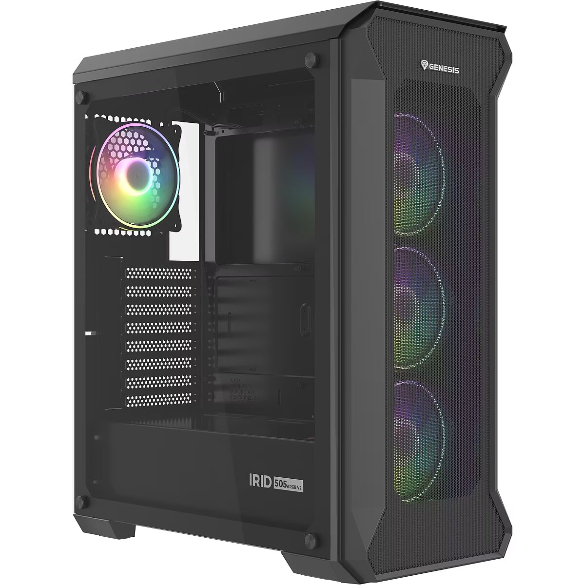 ShortSummaryDescription - GENESIS Irid 505 ARGB, Midi Tower, PC, Black, Transparent, ATX, micro ATX, Mini-ITX, Acrylonitrile butadiene styrene (ABS), Steel, Tempered glass, Gaming