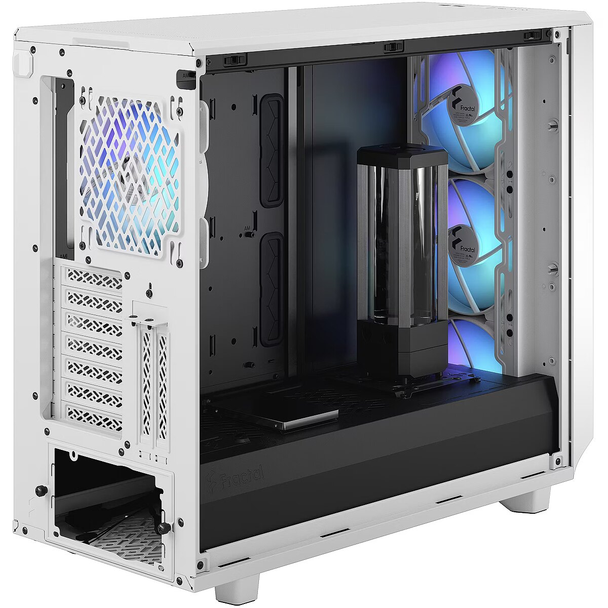 Technical_details - Meshify 2 RGB White TG Clear Tint, tower case The Meshify 2 RGB White TG Clear Tint PC case is a high-performance case with an equally elegant and expressive design. It features a screwless tempered glass side panel, a fully removable top panel for easy component installation, and a mesh front panel with USB-C port and removable dust filter. Thanks to the flexible dual layout of the interior, setups with numerous drives or multiple radiators for optimal cooling are equally possible. Type: Tower case Color white EAN: 7340172703686 Manufacturer No.: FD-C-MES2A-08 Design: midi tower Mainboard form factor: E-ATX Window Kit: Yes Internal dimensions: plug-in card length | maximum 450 mm Internal measurements: CPU cooler height | maximum 185 mm Internal dimensions: PSU form factor | ATX Internal dimensions: PSU length | maximum 250 mm Drive bays: 3.5 inch | internal | 6 pieces Drive bays: 2.5 inch | internal | 2 pieces Slots: Full Size | 7 pieces Slots: additional full-size | 2 pieces Front connectors: 1x audio, 2x USB-A 3.2 Gen 1 (5 Gbps), 1x USB-A 3.2 Gen 1 (10 Gbps) Front connectors: The designation USB 3.2 Gen 1 corresponds to the former designation USB 3.1 Gen 1 / USB 3.0. Front connectors: The designation USB 3.2 Gen 2 corresponds to the former designation USB 3.1 Gen 2 / USB 3.1. Front: 3x 140 mm Aspect 14 RGB fans available, alternatively 3x 120 mm fans can be installed Rear: 1x 140 mm Aspect 14 RGB fan available, alternatively 1x 120 mm fan can be installed Notes: 3x 140mm or 3x 120mm fans can be installed on the top, 2x 140mm or 2x 120mm fans can be installed on the bottom, top and bottom (mesh front) Water cooling possible: Yes Water cooling possible: Supported radiators | Front: up to 360/280 mm, top: up to 360 mm, back: up to 120 mm, bottom: up to 280 mm Dimensions: Width: 240mm x Height: 454mm x Depth: 541mm Weight: 11.1 kg