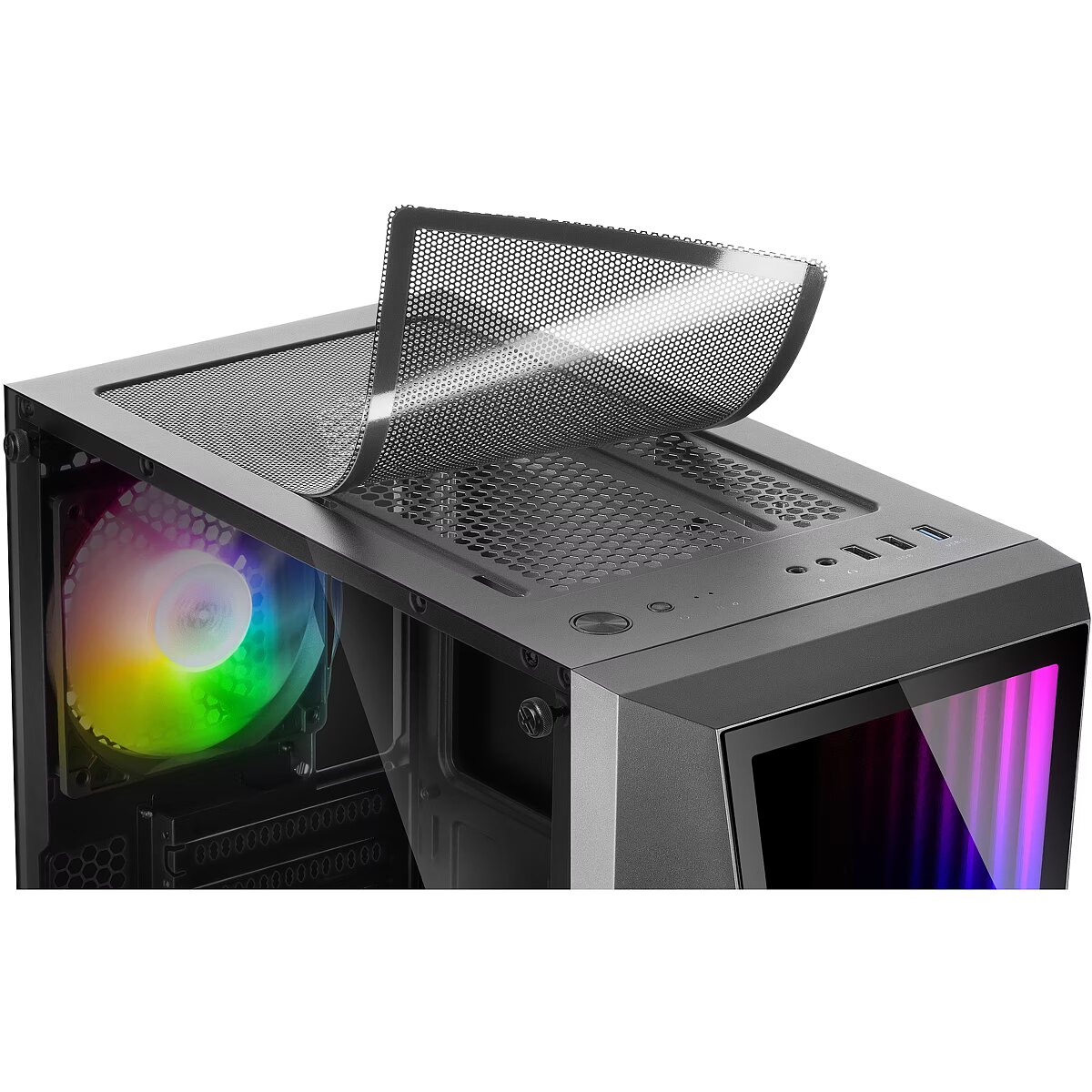 LongDesc - Be mesmerized by its ARGB INFINITY MIRROR while enjoying powerful double cooling as standard and plenty of space for all your components.INFINITY MIRROR ARGBIts front features a multi-layer mirror with ARGB lighting that will mesmerize you with an infinite depth effect. Easily choose between 17 preset modes synchronized with the two included fans or use the ARGB connector to control the entire system with an ARGB controller or motherboard. Choose the mode that best suits your setup and enjoy an endless range of aesthetic possibilities. ARGB LIGHTINGAVAILABLE IN 2 VERSIONSAvailable in two finishes, black and white. Choose the one that best suits your setup! LARGE CAPACITYMC777 offers you a large internal space for the installation of high-performance components, offering support for ATX, microATX and mini-ITX boards, support for liquid cooling up to 240mm, up to 3 2.5" SSD drives and 2 3.5" HDD drives, and fully efficient internal cable management.ADVANCED COOLING AS STANDARDA constant airflow is the key to extending the lifespan of your components and keeping your system running at peak performance. The MC777 eliminates any temperature problems while maintaining silence thanks to a constant airflow provided by its 2 pre-installed 120 mm fans (1 front and 1 rear) and its unrestricted airflow vents. You can also expand the number of fans up to 6 to maximize cooling.TEMPERED GLASS WINDOWFeaturing a full-length tempered glass window, the MC777 case lets you show off your PC in all its glory.
