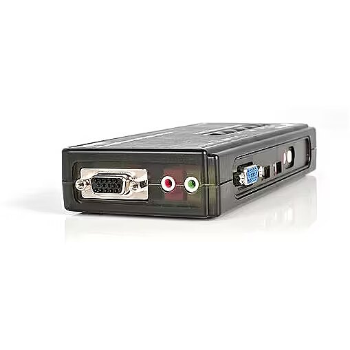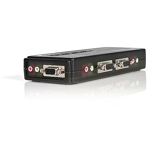 LongSummaryDescription - StarTech.com 4 Port Black USB KVM Switch Kit with Cables and Audio. Keyboard port type: USB, Video port type: VGA, Console ports: 3.5mm headphone, 3.5mm mic, USB A, VGA (D-Sub). HD type: 2K Ultra HD, Maximum resolution: 2048 x 1536 pixels, Number of users: 1 user(s). Product colour: Black, Housing material: Plastic, Cable length: 1.2 m. Compliance certificates: RoHS. Width: 95 mm, Depth: 61 mm, Height: 25 mm