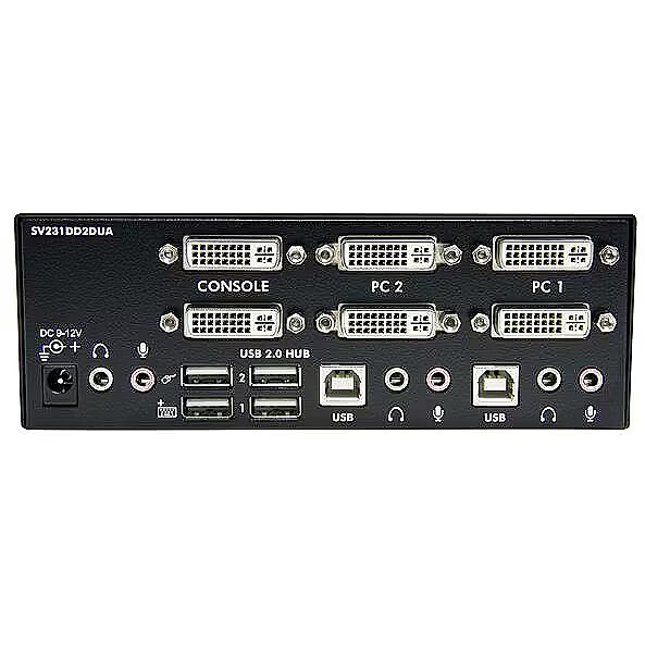 LongDesc - Share a keyboard, mouse and dual DVI displays/monitors between 2 multimedia computersThe SV231DD2DUA 2-port Dual DVI USB KVM Switch allows two PCs, each with dual DVI video outputs, to share two monitors, one microphone and set of speakers, one keyboard and one mouse as well as two other USB peripherals. An ideal solution for graphic designers, CAD/CAM designers or educational and financial institutions, the dual view KVM Switch allows you to instantly switch back and forth between dual DVI display PCs at the touch of a button, while maintaining professional level video quality on both monitors. The dual DVI switch also features an integrated USB hub port that allows USB 2.0 peripherals such as thumb drives, external hard drives or web cams to be shared between attached systems - eliminating duplicate peripheral costs.Please Note: This KVM switch supports DVI-D (digital) signaling only and it is recommended wherever possible to use DVI-D cabling across all PC to KVM and KVM to Console connections to ensure proper function. Please contact technical support if you require assistance identifying the proper cables.Backed by a StarTech.com 3 year warranty and free lifetime technical support.The StarTech.com Advantage- Integrated USB 2.0 hub and Mic/Audio ports allow the user to have full multimedia control of two computers and share USB peripherals eliminating the expense of duplicate devices- Take full advantage of Dual head video cards by switching both machines across two high resolution DVI monitors- Absolutely no software or drivers required providing a completely OS independent KVM solution