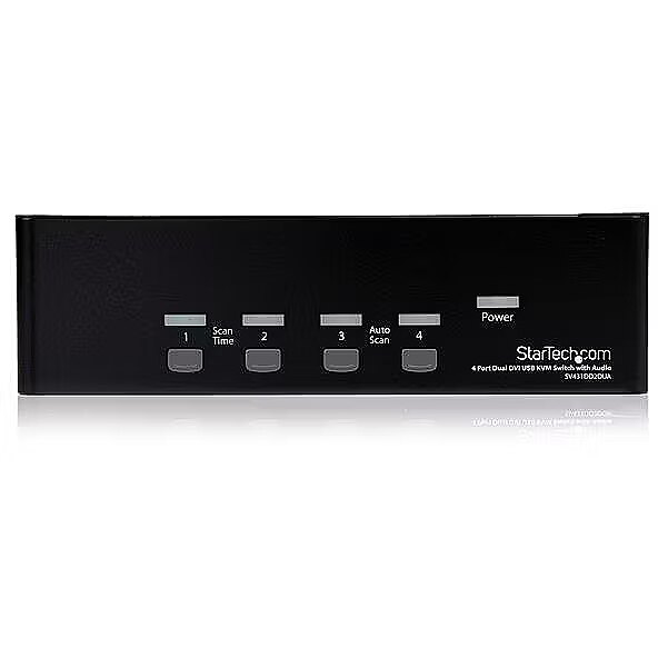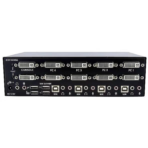 LongDesc - Share a keyboard, mouse and dual DVI displays/monitors between 4 multimedia computersThe SV431DD2DUA 4-port Dual DVI USB KVM Switch allows up to four PCs, each with dual DVI video outputs, to share two monitors, one microphone and set of speakers, one keyboard and one mouse as well as two other USB peripherals. An ideal solution for graphic designers, CAD/CAM designers or educational and financial institutions, the dual view KVM Switch allows you to instantly switch back and forth between dual DVI display PCs at the touch of a button, while maintaining professional level video quality on both monitors. The dual DVI switch also features an integrated USB hub port that allows USB 2.0 peripherals such as thumb drives, external hard drives or web cams to be shared between attached systems - eliminating duplicate peripheral costs.Please Note: While both DVI-I (analog mode) and DVI-D (digital only) are supported by the KVM, both source PCs should output the same signal type for proper switching. It is recommended wherever possible to use DVI-D cables across all PC to KVM and KVM to Console connections. Please contact technical support if you require assistance identifying your source.Backed by a StarTech.com 3 year warranty and free lifetime technical support.The StarTech.com Advantage- Integrated USB 2.0 hub and Mic/Audio ports allow the user to have full multimedia control of two computers and share USB peripherals eliminating the expense of duplicate devices- Take full advantage of Dual head video cards by switching up to four machines across two high resolution DVI monitors- Absolutely no software or drivers required providing a completely OS independent KVM solution