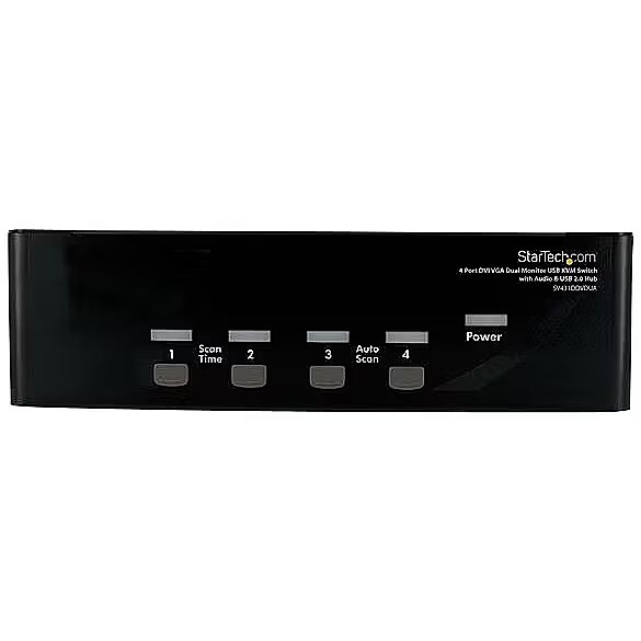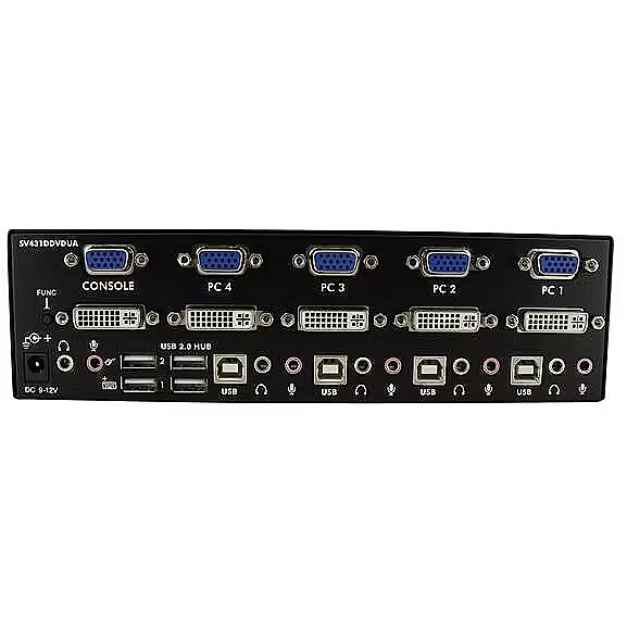 LongDesc - The SV431DDVDUA 4-port DVI VGA dual monitor KVM switch lets you control 4 Dual Display computers using a single USB mouse and keyboard peripheral set.This dual view KVM switch provides 1 VGA and 1 DVI-I port per computer connection for high-resolution video, as well as audio switching capability between connected computers.The DVI/VGA KVM switch features an integrated 2-port USB hub that allows USB 2.0 peripherals to be shared between connected computers, and offers a compact design with a rugged metal chassis for durable performance.NOTE: While both DVI-I (analog) and DVI-D (digital) are supported by the KVM, source PCs must output the same signal for proper switching. It is recommended wherever possible to use DVI-D cables across all PC to KVM and KVM to Console connections. If necessary, please contact technical support for assistance identifying your source.Backed by a StarTech.com 3-year warranty and free lifetime technical support.The StarTech.com Advantage- High-resolution DVI and VGA ports support almost any dual display scenario; even with one DVI + VGA PC, and one dual DVI PC, an adapter can be used with this KVM to support your configuration- Integrated USB 2.0 hub and Mic/Audio ports allow the user to have full multimedia control of two computers and share USB peripherals eliminating the expense of duplicate devices- Absolutely no software or drivers required providing a completely OS independent KVM solution