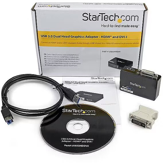 LongDesc - USB 3.0 External Video & Graphics Card | Multi-Monitor | USB-Powered | Supports Mac & Windows®The USB32HDDVII USB 3.0 to HDMI® and DVI-I Dual Head Adapter turns an available USB 3.0 port into one DVI-I or VGA port (DVI to VGA adapter included) and one HDMI® output, with support for high-definition 1080p and 1920x1200 video and 5.1 surround sound audio (from HDMI® port only). Each display can simultaneously support the maximum resolution of 2048x1152 @ 60Hz.The adapter delivers a convenient external video solution that makes it easy to add multi-monitor capability to a USB enabled desktop or laptop computer (optimal performance from USB 3.0, backward compatible with USB 2.0).Leveraging the high-bandwidth (5 Gbps) SuperSpeed USB 3.0 interface, the USB video adapter functions as a convenient external graphics card that eliminates having to open the computer case for video card installation. The adapter delivers smooth, high definition content to multiple displays and can be used to mirror your primary desktop, showing the same image on each display, or to extend your desktop onto a second or third monitor to double or triple your workspace and increase your productivity.The USB 3.0 HDMI® and DVI-I Adapter is backed by a StarTech.com 2-year warranty and includes free lifetime technical support.The StarTech.com Advantage