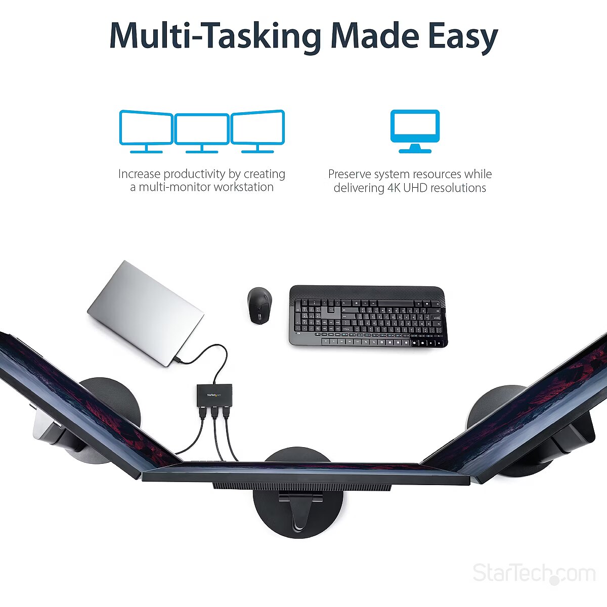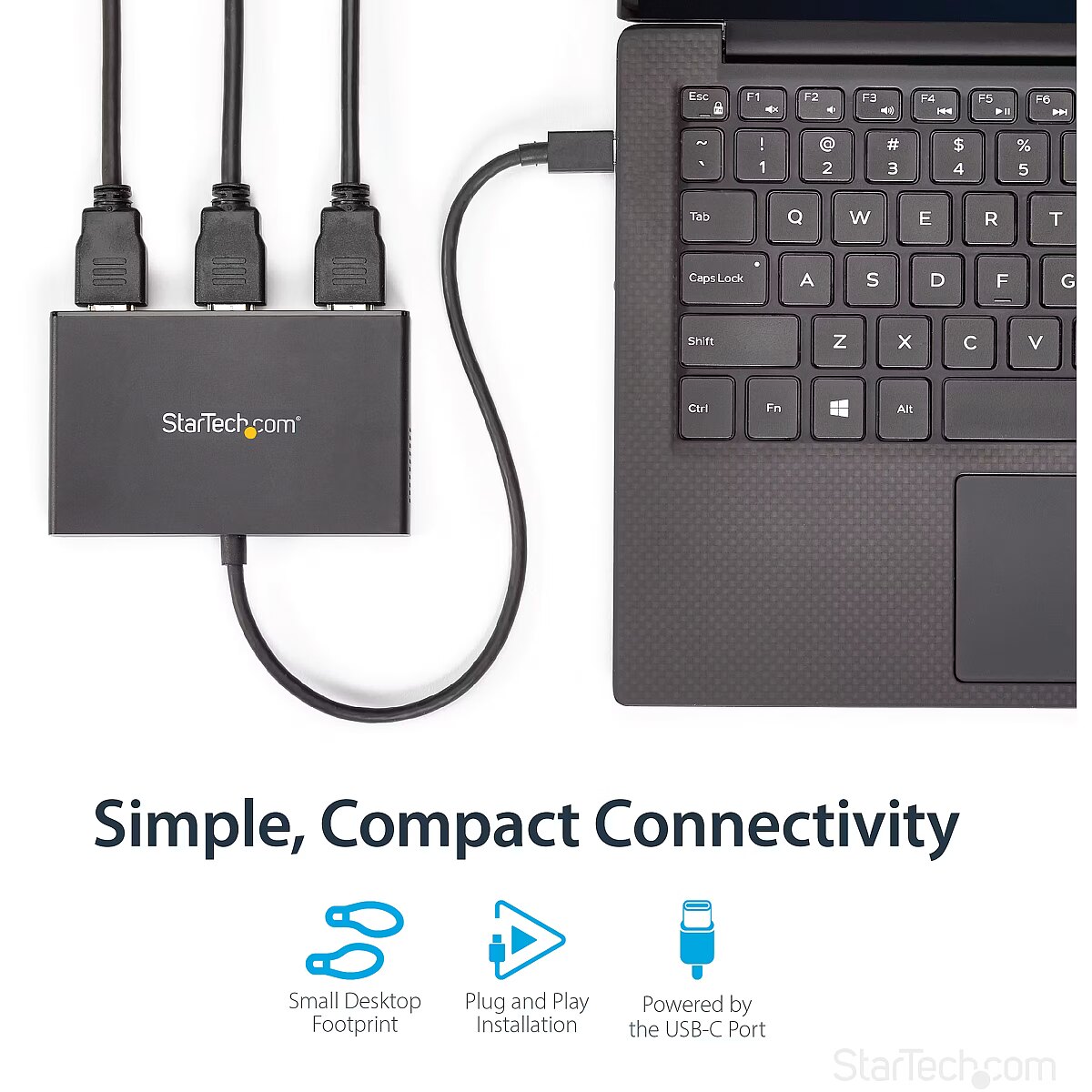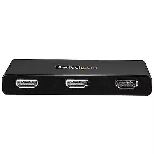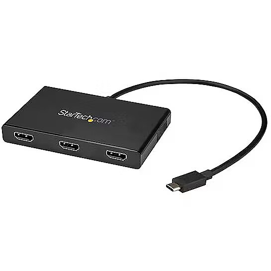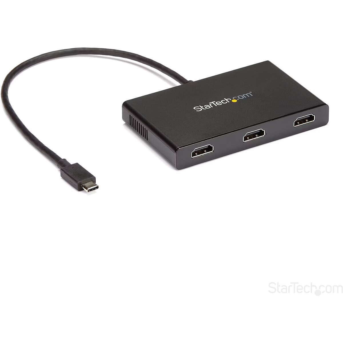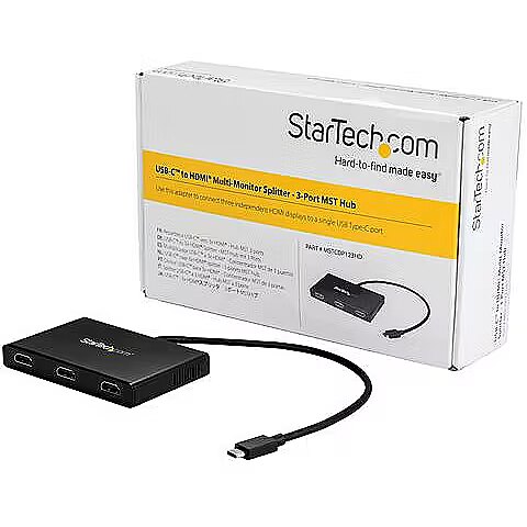 LongDesc - Create a high-performance triple-display workstation by connecting a USB Type-C™ device to three independent HDMI® monitorsThis 3-port USB-C to HDMI MST hub lets you connect three HDMI monitors to your USB Type-C Windows device, conveniently helping you to increase and maximize your productivity.Multi-tasking Made EasyWith devices becoming more portable than ever, you can be limited to fewer video outputs and confined to your small integrated screen. This multi-stream transport hub solves that problem by enabling you to connect three displays to your USB-C computer, making multi-tasking much easier.Using this USB-C to HDMI video splitter, you can mirror your display onto additional monitors or stream independent content to each display which makes it the ideal accessory for travel or hot-desking.Astonishing Picture QualityMST technology uses your existing video card to minimize the use of system resources while delivering UHD 4K resolutions for up to two monitors simultaneously. Plus, because the USB-C hub can output HD 1080p on three independent displays, it’s perfect for all high-resolution applications such as graphic design and medical imaging.Hassle-Free SetupMulti-stream transport offers an easy setup, by natively working on any Windows device that supports DP Alt Mode over USB Type-C. This USB-C to HDMI adapter is Thunderbolt 3 compatible and offers for plug-and-play installation with no drivers or software required. Additionally, this triple monitor adapter is powered by the USB-C port, meaning no external power cords are necessary.MSTCDP123HD is backed by a StarTech.com 3-year warranty, and free lifetime technical support.The StarTech.com Advantage