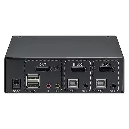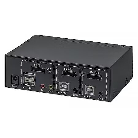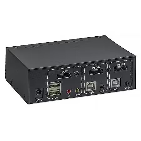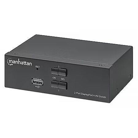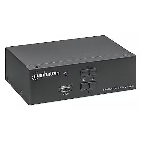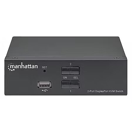 LongDesc - DisplayPort KVM Switch with 2 ports – Easy access and control in 4K UHDThe Manhattan 2-Port DisplayPort KVM Switch is a compact solution for providing access and control over two DP/USB-equipped computers from a single keyboard, mouse and monitor. It helps save you time on installation with its included combo cables — there's no need to purchase additional ones — that easily connect directly to the system.Easy to use for improved efficiencyThis KVM Switch helps you access your systems more efficiently without the expense and clutter of extra keyboards, mice, and monitors. You select your connected computers and audio/mic channels through the front-panel push-buttons or keyboard hotkeys. The enhanced control this KVM switch provides is ideal for high graphical content in applications like video editing, digital signage server control, medical imaging, multimedia design or dual system control workstations.4K resolution at 60 Hz and full audio supportThe ever-growing demand for higher video quality and the evolution of DisplayPort technology has put 4K-enabled computers and displays in many visually ambitious workplace and commercial applications. Supporting up to 3840 x 2160 (4K) resolution at smooth 60 Hz, this KVM Switch is right at home in your Ultra-High-Definition-equipped setup. Use an MST adapter (available from Manhattan) to connect a second monitor for maximized viewing. You also get full audio compatibility, with support for digital audio and separate analog 3.5 mm stereo audio jacks for microphones and speakers or headphones.Additional USB hub portThe integrated USB 2.0 hub offers a front-facing USB-A port in addition to keyboard and mouse ports. This hub port works among your attached computers as if it were directly connected to your host computer so you can avoid having to constantly plug/unplug devices such as printers, storage drives or scanners.Compatible with Windows®, Mac®, Linux® and moreBeing OS independent, this DP KVM switch not only supports Windows, Mac OS and Linux, but it is also compatible with Unix® and even Novell® NetWare to fully support older legacy hardware.