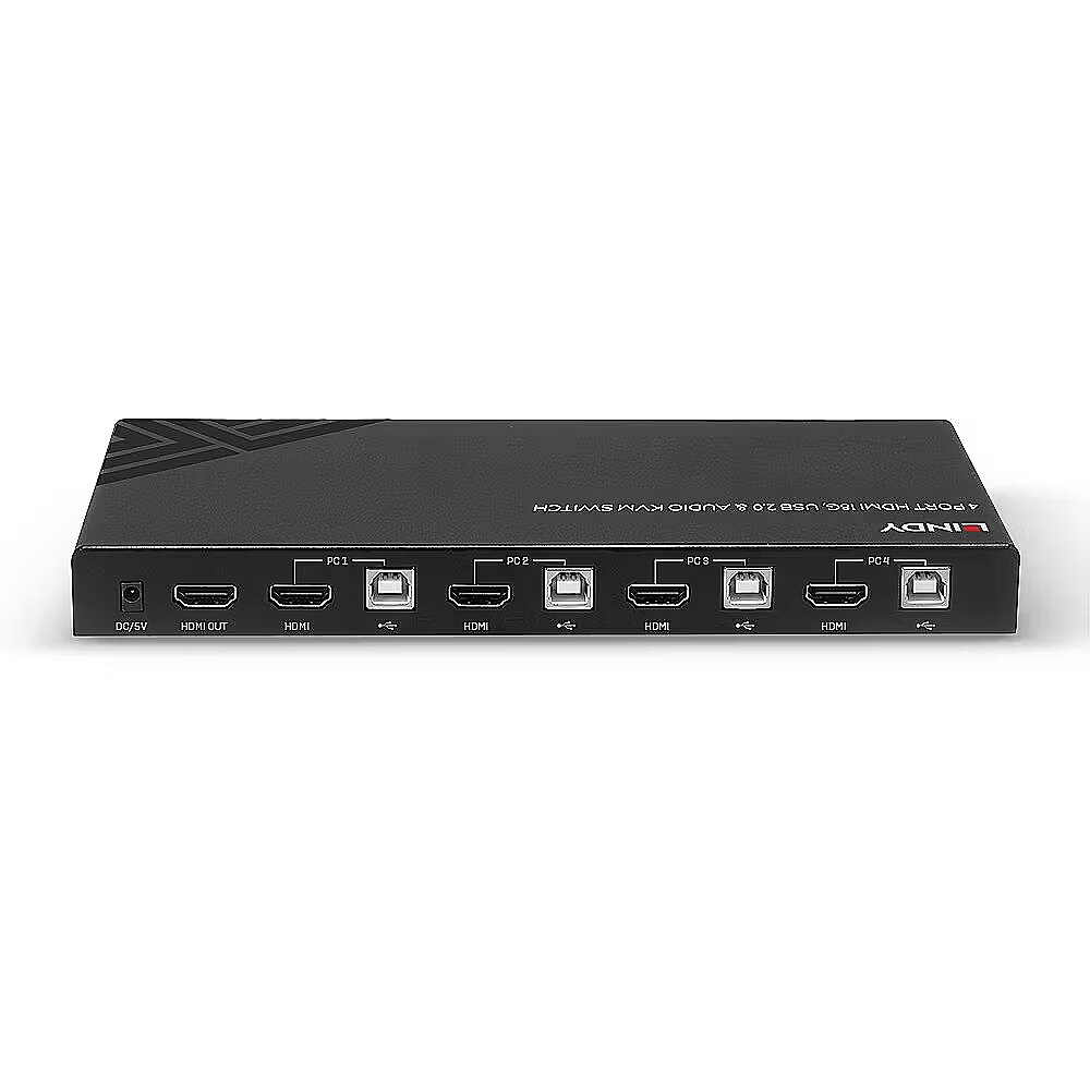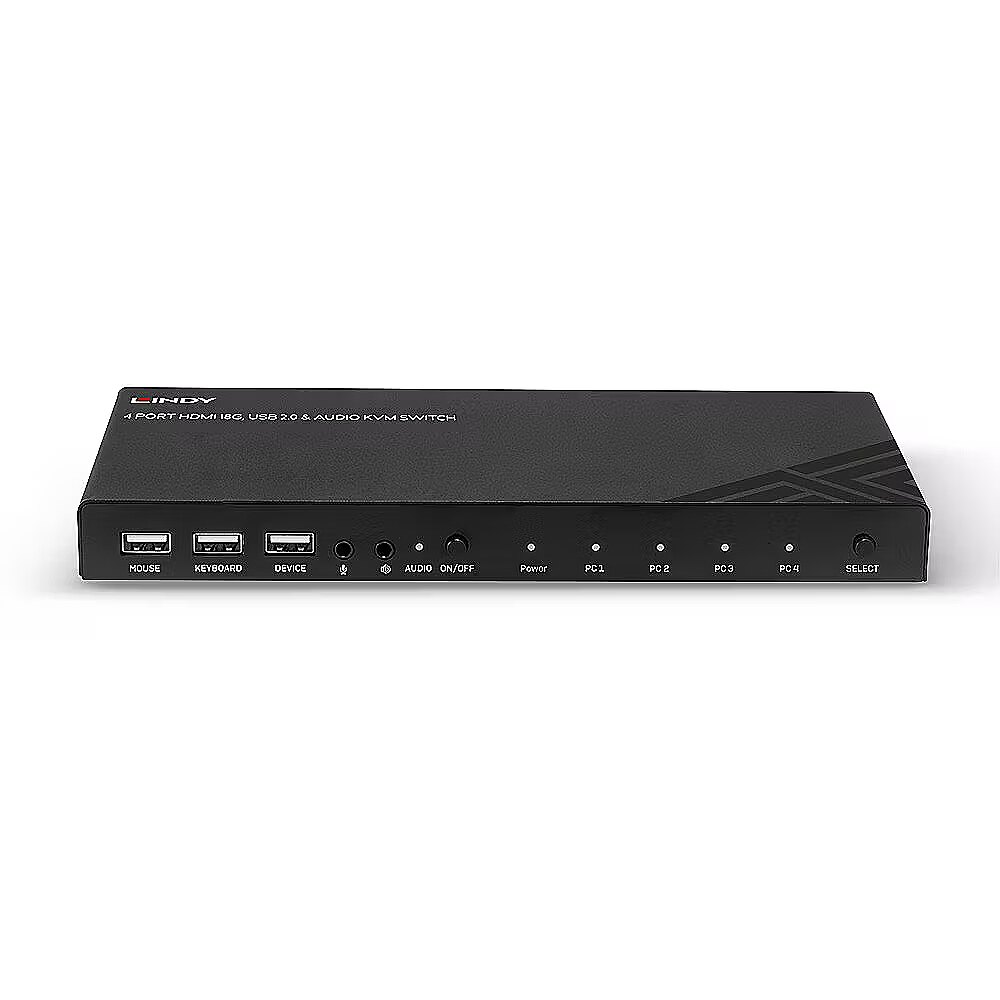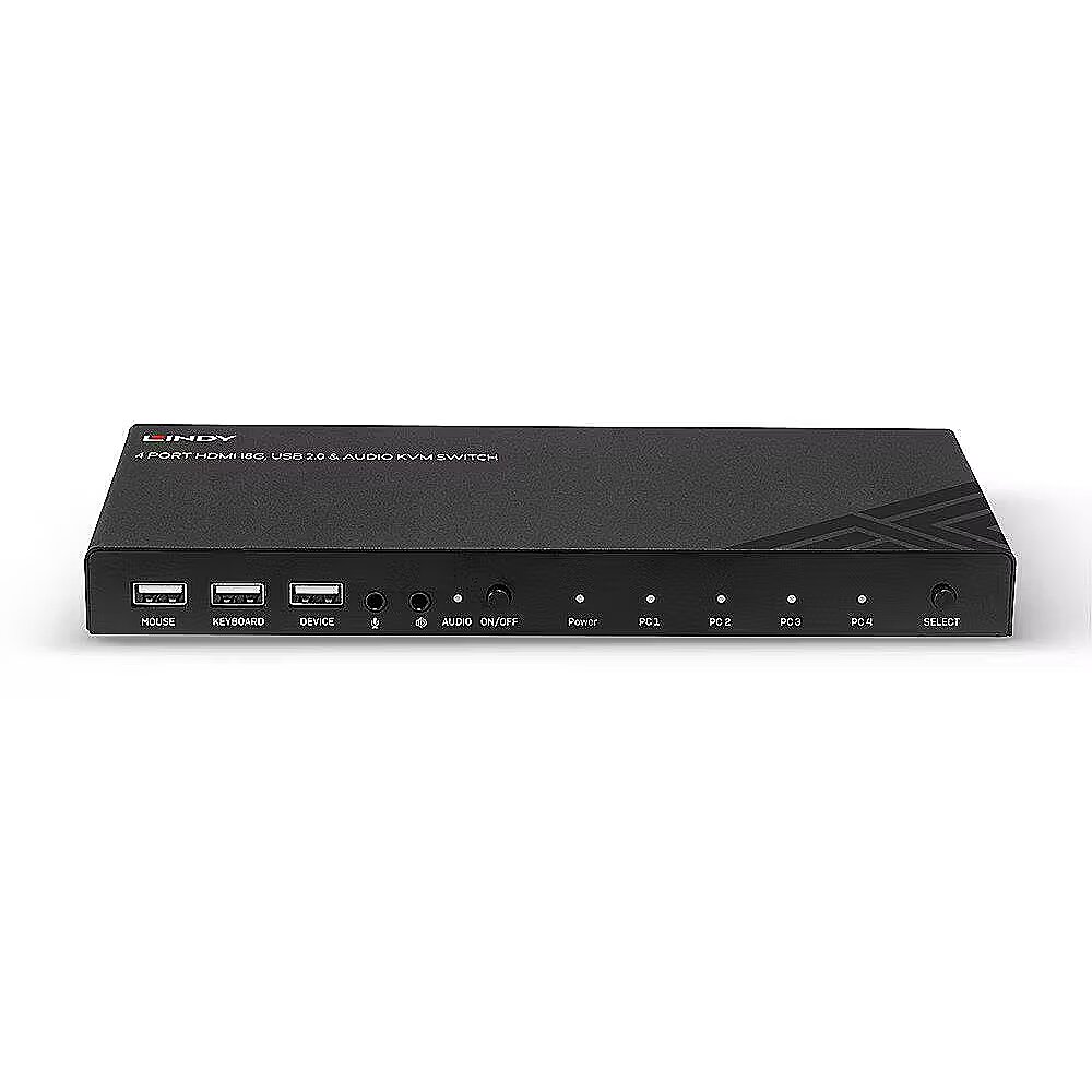 LongDesc - Controls four HDMI equipped PCs from a single keyboard, mouse and monitorSwitch via the unit's push button or keyboard hotkeysSupports HDMI 18G resolutions up to 4K@60Hz 4:4:4 with HDR3.5mm stereo audio ports to connect microphone, speakers or headphones2 year warrantyA KVM switch allows an operator to conveniently control and manage multiple devices, such as PCs and servers, from a single keyboard, mouse and display console.The Lindy 4 Port HDMI 4K60, USB 2.0 & Audio KVM Switch is a compact solution for providing access and control over four HDMI equipped PCs from a single keyboard, mouse and monitor setup.Support for resolutions up to 4K Ultra HD 60Hz ensures the highest image quality, perfect for demanding graphical content in gaming setups, video editing or quad system control workstations. The additional support for High-Dynamic Range ensures video content can be seen with enhanced brightness, greater contrasts and a much wider colour gamut. The audio output ports on the main unit also allow users to connect headphones or speakers to add immersive 2CH audio and a microphone, pressing the Audio On/Off button on the front panel mutes these devices. These ports are not connected to the HDMI signal but to a built-in USB converter while an additional USB device  such as a printer, scanner or hard drive can be connected to the additional USB port on the front panel.The KVM switch features two switching options including push buttons on the unit and keyboard hotkeys provide simple, reliable control for the user, great for both professional and first time users.