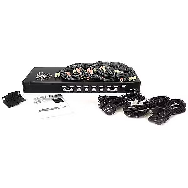 LongSummaryDescription - StarTech.com 8 Port Rackmount USB VGA KVM Switch w/ Audio (Audio Cables Included). Keyboard port type: USB, Mouse port type: USB, Video port type: VGA. Maximum resolution: 1920 x 1440 pixels, Maximum analog resolution: 1920 x 1440 pixels, Number of users: 1 user(s). Product colour: Black, Rack capacity: 1U, Housing material: Steel. Input voltage: 110-240 V, Input current: 1.8 A, Output voltage: 12 V. Compliance certificates: RoHS