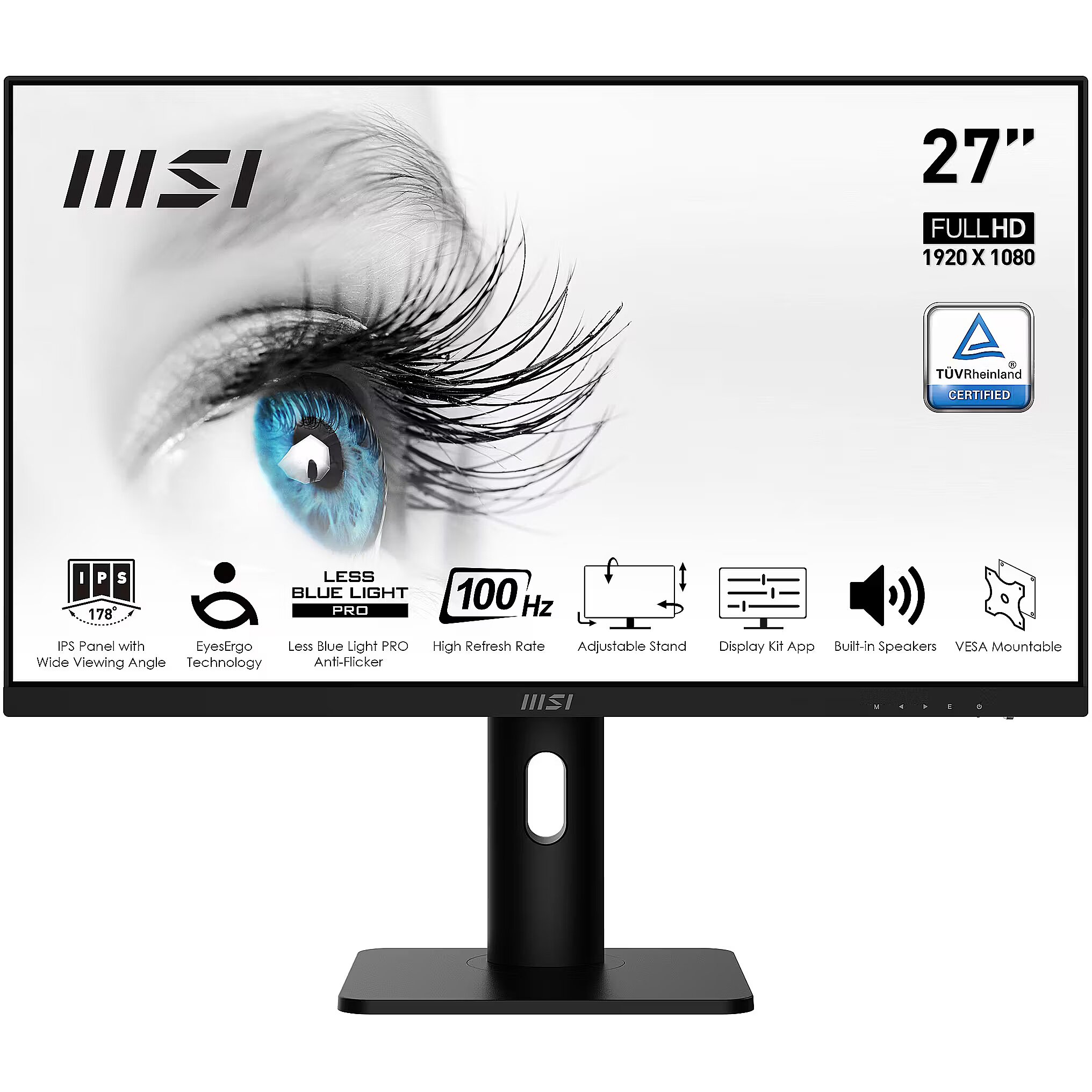 Summary - MSI Pro MP273AP. Display diagonal: 68.6 cm (27"), Display resolution: 1920 x 1080 pixels, HD type: Full HD, Display surface: Matt, Response time: 1 ms, Native aspect ratio: 16:9, Viewing angle, horizontal: 178°, Viewing angle, vertical: 178°. Built-in speaker(s). VESA mounting, Height adjustment. Product colour: Black