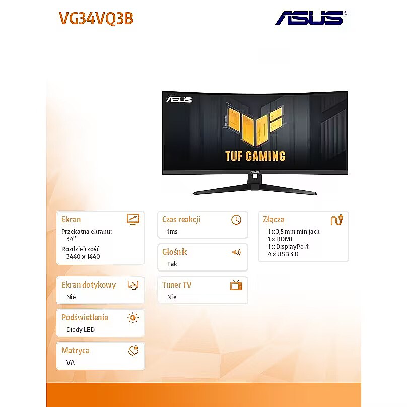 Summary - ASUS TUF Gaming VG34VQ3B. Display diagonal: 86.4 cm (34"), Display resolution: 3440 x 1440 pixels, HD type: UltraWide Quad HD, Display technology: LED, Response time: 1 ms, Native aspect ratio: 21:9, Viewing angle, horizontal: 178°, Viewing angle, vertical: 178°. Built-in speaker(s). Built-in USB hub, USB hub version: 3.2 Gen 1 (3.1 Gen 1). VESA mounting. Product colour: Black