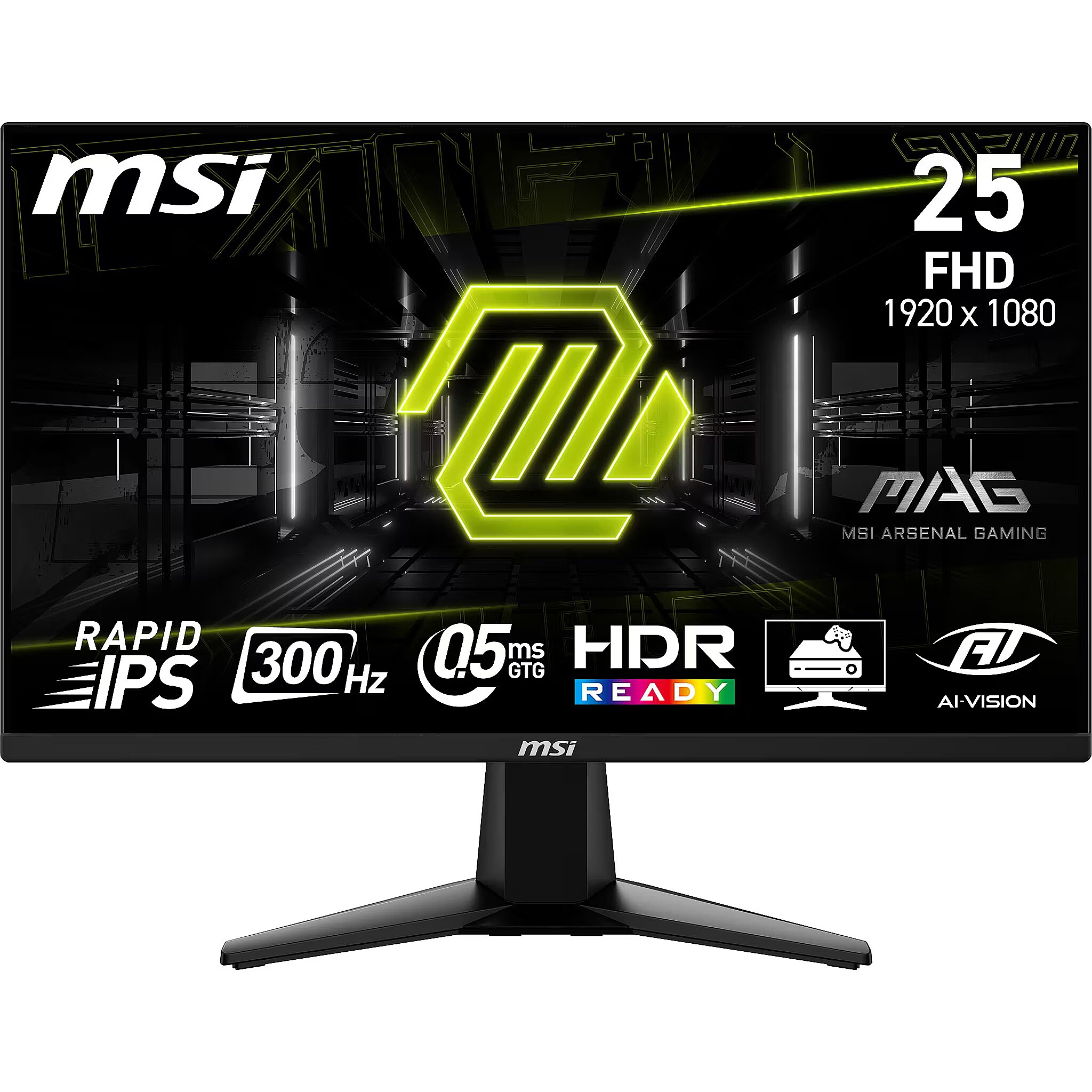Description - The MSI ARSENAL GAMING (MAG) series is engineered to give gamers the edge they need to dominate on the virtual battlefield. Inspired by the rugged durability and unwavering reliability of military-grade equipment, the MAG series is built to provide an unwavering defense in every gaming scenario. However, MAG isn't just about performance; it's a design language that conveys ruggedness and toughness, embodying the very essence of the MAG style. For gamers who are determined to dominate their digital battlegrounds, the MAG series is here to stand with you, establishing the ultimate defense. Rapid IPS Panel - Provides 0.5ms (GtG, Min.) response time, optimizes screen colors and brightness. 300Hz Refresh Rate - Respond faster with smoother frames. 0.5ms (GtG, Min.) Response Time - Eliminate screen tearing and choppy frame rates. AI Vision The new AI Vision technology can not only reveal details in dark areas but also enhance overall brightness and saturate colors. Less Blue Light - Use a software solution to reduce the light emission in the blue-violet region of the blue light spectrum.
