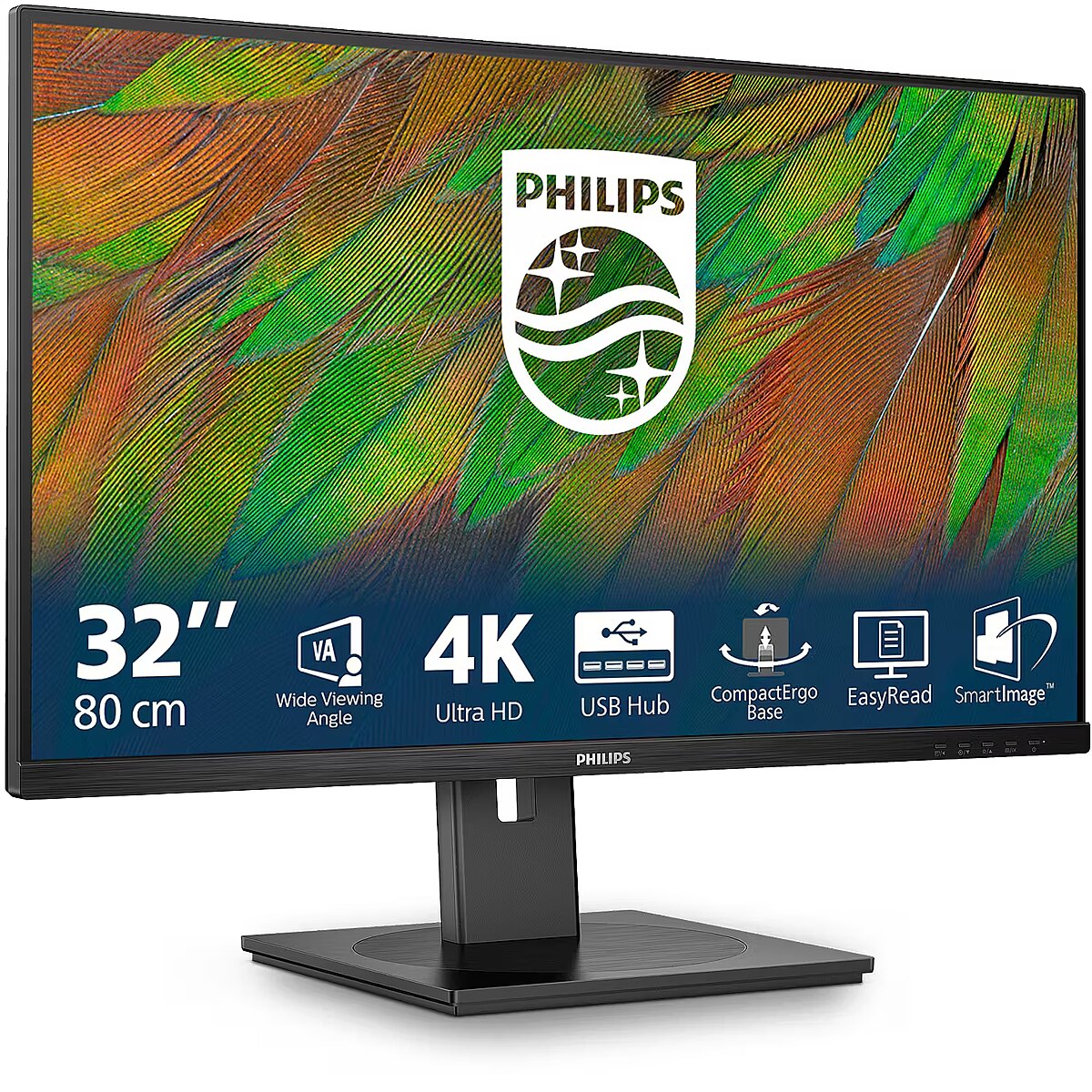 LongSummaryDescription - Philips 3000 series 32B1N3800/00. Display diagonal: 81.3 cm (32"), Display resolution: 3840 x 2160 pixels, HD type: 4K Ultra HD, Display technology: LCD, Response time: 4 ms, Native aspect ratio: 16:9, Viewing angle, horizontal: 178°, Viewing angle, vertical: 178°. Built-in speaker(s). Built-in USB hub, USB hub version: 3.2 Gen 1 (3.1 Gen 1). VESA mounting, Height adjustment. Product colour: Black