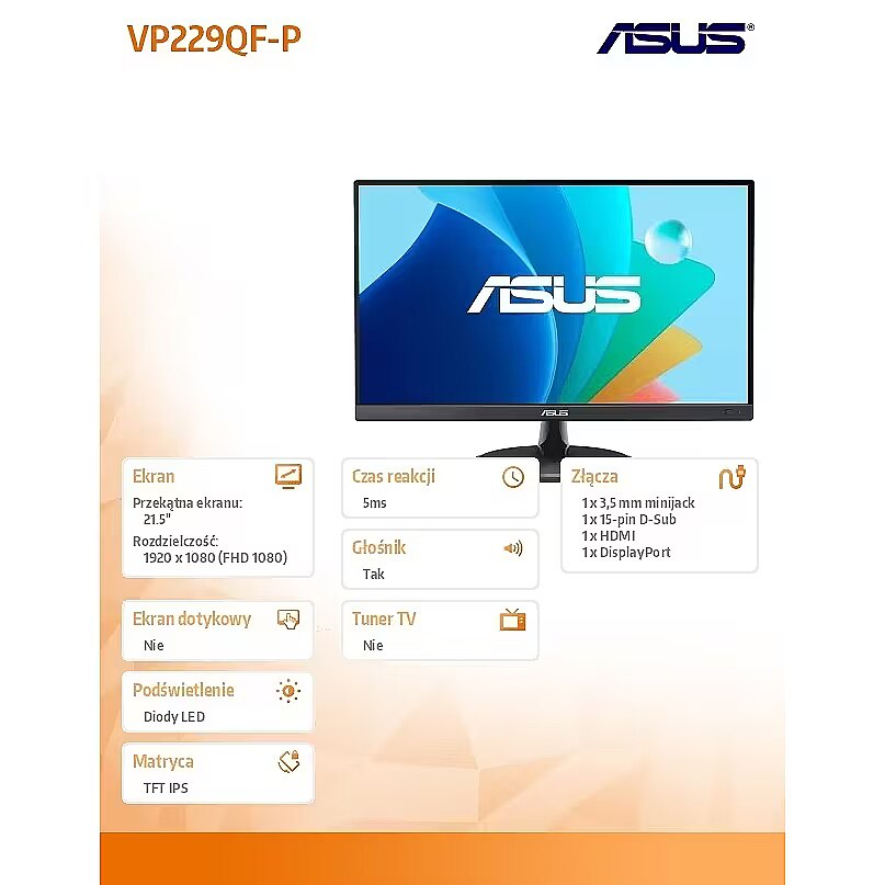 This Asus VP229QF-P, 21.5" monitor with FHD 1920x1080 resolution is suitable for comfortable work with documents, web content, and multimedia. It provides natural image reproduction, comfortable viewing, and stable performance, satisfying user needs for a universal work screen.