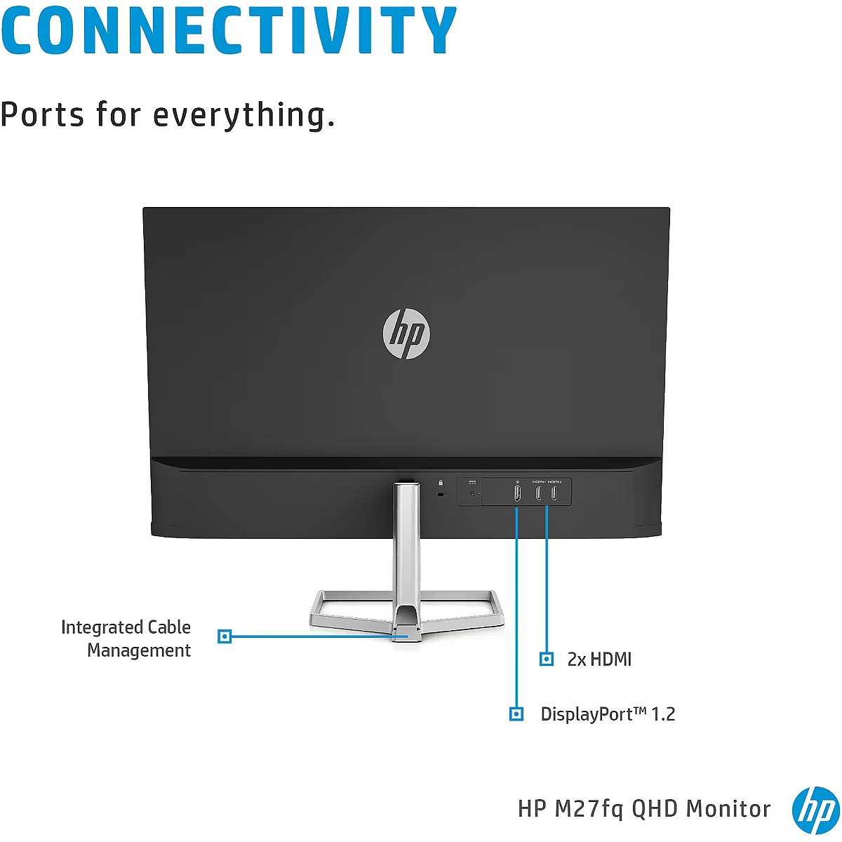 LongSummaryDescription - HP M27fq QHD Monitor. Display diagonal: 68.6 cm (27"), Display resolution: 2560 x 1440 pixels, HD type: Quad HD, Display technology: LCD, Display surface: Matt, Response time: 5 ms, Native aspect ratio: 16:9, Viewing angle, horizontal: 178°, Viewing angle, vertical: 178°. Product colour: Silver