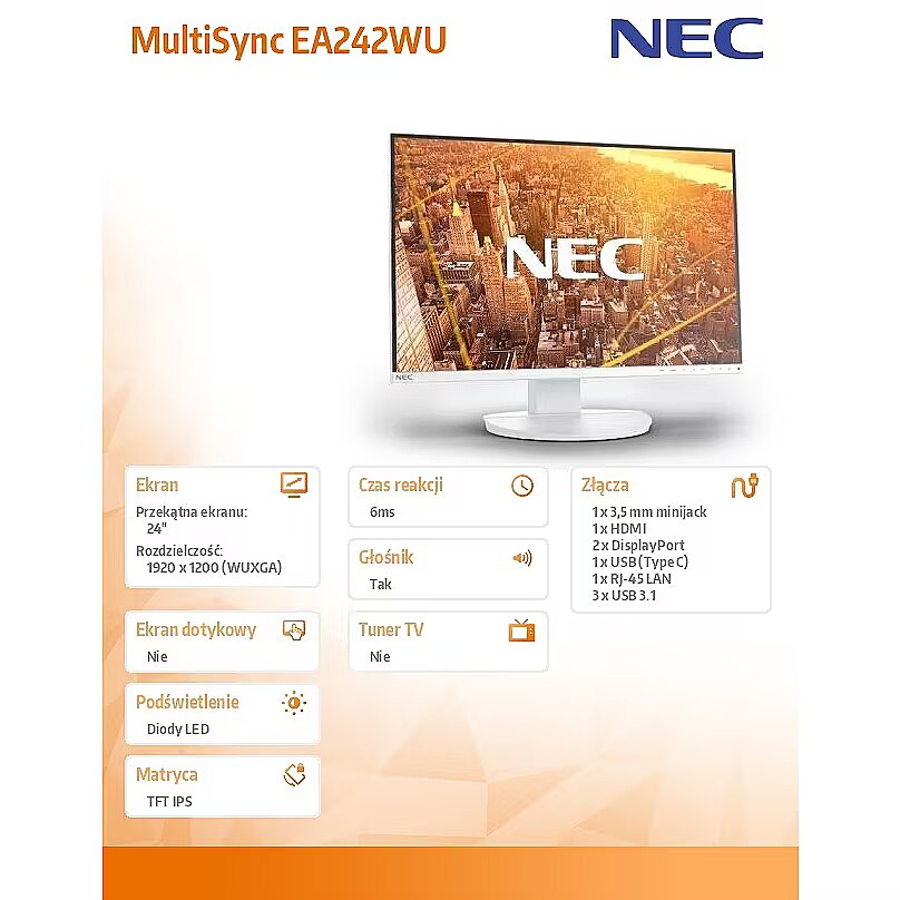This NEC EA242WU-WH, 24" monitor with WUXGA 1920x1200 resolution is suitable for comfortable work with documents, web content, and multimedia. It provides natural image reproduction, comfortable viewing, and stable performance, satisfying user needs for a universal work screen. Ievads - for home and office ?>