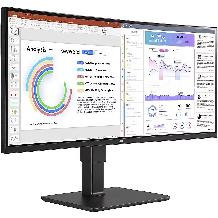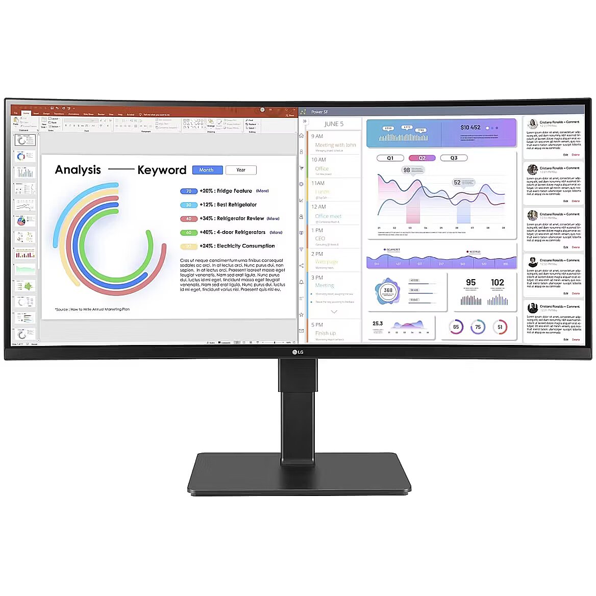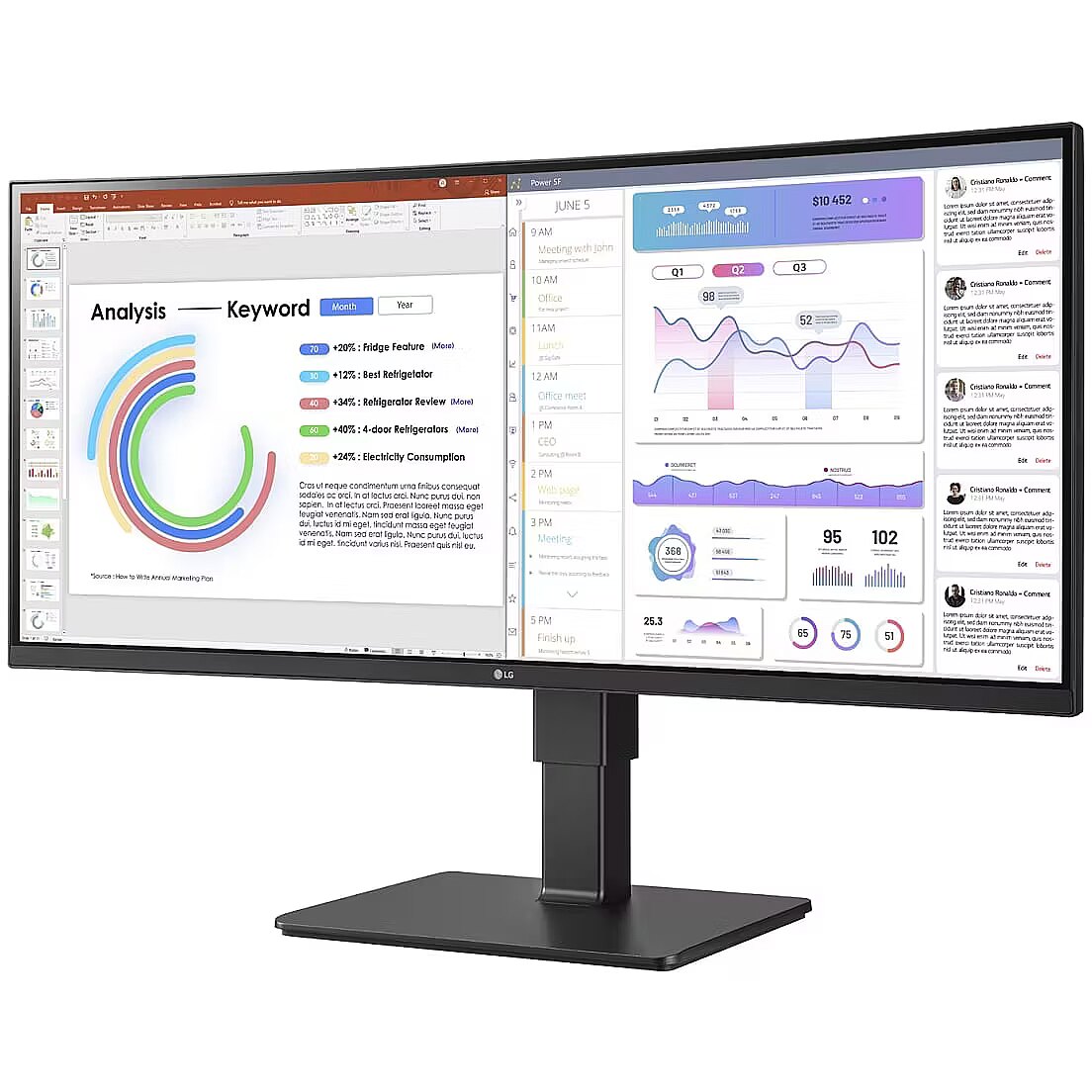 LongDesc - 34" WQHD IPS DisplayThe Monitor for the Hard Working Person!LG WQHD (3440x1440) Monitor with IPS technology delivers crips images & dazzling color while providing a large work space for multi-tasking.34" 21:9 UltraWide™ WQHD DisplayMore Space for Multi-TaskingThe UltraWide™ Curved QHD screen (3440x1440 resolution, 21:9 aspect ratio) is great for work. It has a large viewing area for things like documents, images, & audio, allowing them to viewed at the same time side-by-side.HDR10Detailed ContrastHDR-compatible monitors display brighter whites and blacker blacks compared to SDR displays. HDR renders dark and bright areas of an image with many more details, which were indiscernible under the old standards.IPS with sRGB 99% (Typ.)Great Colors and Wider ViewThe 34BQ77QC-B monitor displays great colors and a wider viewing angle. The IPS display boasts 99% coverage of the sRGB color spectrumReader ModeReader Mode creates a screen with a color temperature similar to paper and provides optimal condition for reading.Flicker SafeFlicker Safe reduces invisible flickering on the screen.USB Type-C™Easy Control and Connectivity34BQ77QC-B has a USB Type-C™ port that allows you to charge laptops (up to 90W), transfer data quickly and connect displays. It is also compatible with Mac devices*. Create the ideal workstation with a single cable.Built-in Speakers with MaxxAudio®The 35” QHD UltraWide Monitor features 5W stereo speakers with MaxAudioMulti PortsA Variety of InterfaceThis monitor offers USB Type-C™, DisplayPort, HDMI, RJ45 (Ethernet), and USB (1Up/4Down) compatible with existing devices for a smooth display and Headphone out port support hardware connectivity.Control with a Few ClicksYou can customize the workspace by splitting the display or adjusting basic monitor options with just a few mouse clicksErgonomic DesignEasy and ComfortableThe One-Click stand makes it easy to install. Adjust the height and tilt of the big screen to position it in the optimal position for you.