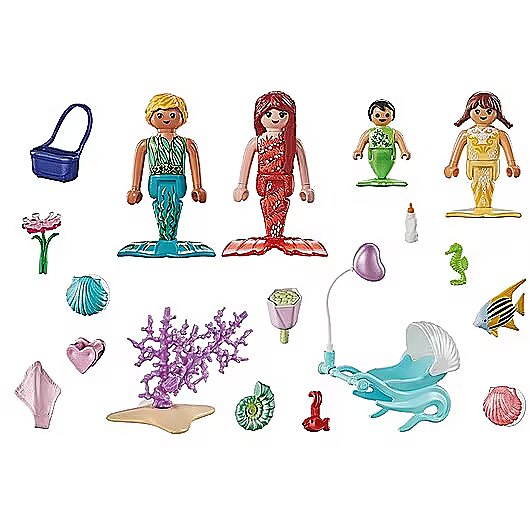 Accessories included - Figures: 1 mermaid, 1 mermaid baby, 1 merman, 1 little mermaid; Animals: 1 fish, 1 small seahorse; Accessories: 1 shell stroller, 1 toy hanger, 1 shoulder bad, 1 baby bottle, 1 cloth, 1 balloon, 1 sea flower, 1 heart, 1 sweet, 1 coral tree, 1 snail shell, 2 decorative shells with suction cup