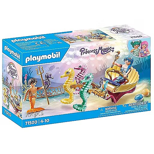 Description - Underwater inhabitants with a seahorse carriage Mermaids traverse the ocean in an elegant seahorse carriage and tenderly care for these underwater creatures. With two decorative shells to attach to smooth surfaces (including suction cup). Dimensions of reason with seahorses: 23 x 10 x 7 cm (L x W x H). Dive in and start playing with the wonderful PLAYMOBIL Underwater Dwellers set with seahorse carriage. The mermaids and their seahorses explore the depths of the ocean as they traverse its boundlessness in a glittering underwater carriage. Wonder what they will manage to discover today? The PLAYMOBIL Princess Magic Mermaids series invites you into a magical underwater world. The beautifully designed figures and animals encourage children aged 4 and up to go on more and more adventures. The set includes two PLAYMOBIL figures, four large seahorses, an underwater carriage and many other accessories. Thanks to the suction cups, the shells can be attached to smooth surfaces.