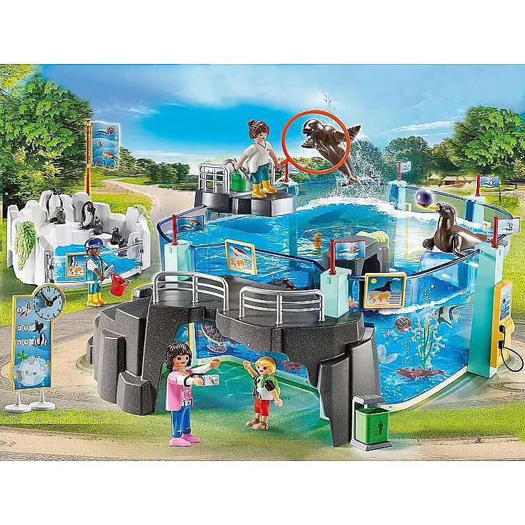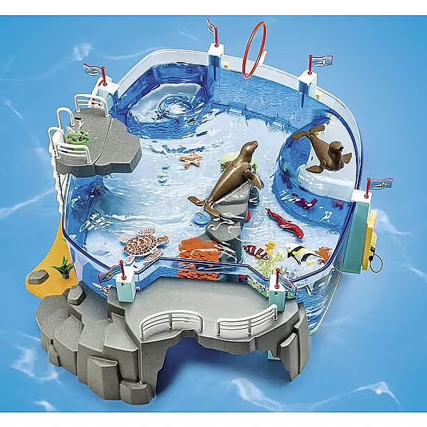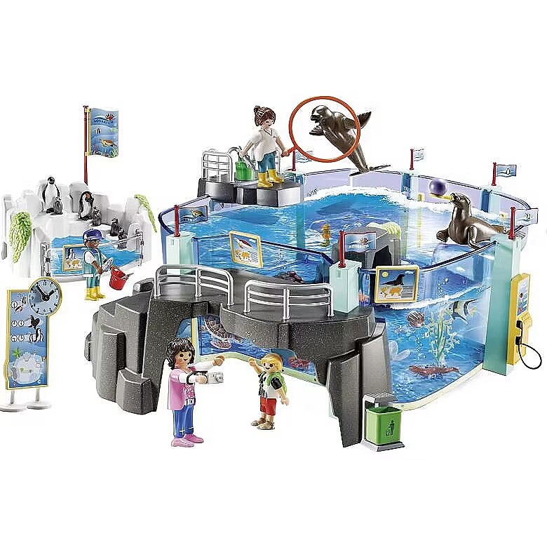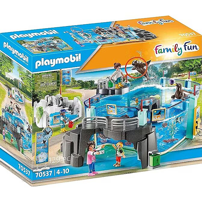 Description - Playmobil Family Fun 70537 Mega Set - Oceanarium Learn all about sea creatures during a visit to the aquarium. Climb up to the observation deck to take a look at the colourful fish from above. It looks like you've made it in time for the sea lion show! Watch them jump through a hoop and balance a ball on their nose. Stand at the observation point and watch the fish swim around you. Visit the penguin enclosure and watch the penguins splash in the water and slide down the slide. Thanks to the special timer, you'll easily know when it's feeding time for each animal. For even more fun, fill the aquarium tank and penguin enclosure with water!  The set includes three figures, two seals, two adult penguins, four baby penguins, colourful fish and sea creatures, a fish bucket, coral, waste baskets, a clock indicating feeding time and other accessories. Recommended for children aged four to ten.  Warning. Choking hazard. Contains small parts. Not for children under three years old.