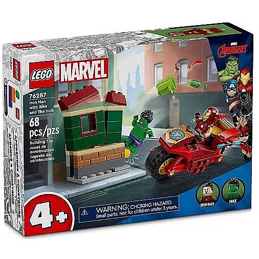Description - Treat any young Super Hero or LEGO fan to this buildable Avengers adventure set. LEGO Marvel Iron Man with Bike and The Hulk (76287) is a build-and-play toy designed to boost the confidence, concentration and problem-solving skills of kids aged 4and up. The LEGO Marvel playset includes Iron Man and Incredible Hulk minifigures, plus Iron Mans buildable, push-along toy motorcycle and a buildable house. Kids activate a function to collapse the building (which happens a lot when Hulk is around!) and then rebuild it in time for Hulks next outburst. The set comes with a vehicle-frame Starter Brick to help kids get building. Intuitive instructions are provided in the colorful picture-story guide. For added digital fun, builders can zoom in and rotate models using the intuitive LEGO Builder app. LEGO Marvel 4+ adventure playsets are a treat for the whole family. As adults pass on their construction skills, they share precious developmental milestones with their budding builder. Iron Man and Incredible Hulk buildable toy This build-and-play LEGO Marvel Iron Man with Bike and The Hulk playset for kids is especially designed for boys and girls aged 4 and up Super Hero set with minifigures Includes Iron Man and Incredible Hulk minifigures, Iron Mans buildable, push-along toy motorcycle, a buildable house and fun accessories Hands-on adventure playset Kids can activate a function to collapse the building (which happens a lot when Hulk is around!) and then rebuild it in time for Hulks next outburst Made for young builders A vehicle-frame Starter Brick gets building started fast, so theres more time to play LEGO Marvel Avengers gift for kids This creative-play, collectible set is a fun, buildable toy for preschool Super Heroes aged 4 and up More Super Hero playsets Check out the full range of LEGO Marvel build-and-play sets for even more creative and imaginative fun Preschool playsets LEGO 4+ sets introduce children to a universe of movie favorites, TV characters and everyday heroes 68-piece set for ages 4+ The motorcycle measures over 1 in. (4 cm) high, 3 in. (9 cm) long and 1 in. (3 cm) wide; the house measures over 2 in. (6 cm) high, 2 in. (6 cm) wide and 1 in. (3 cm) deep